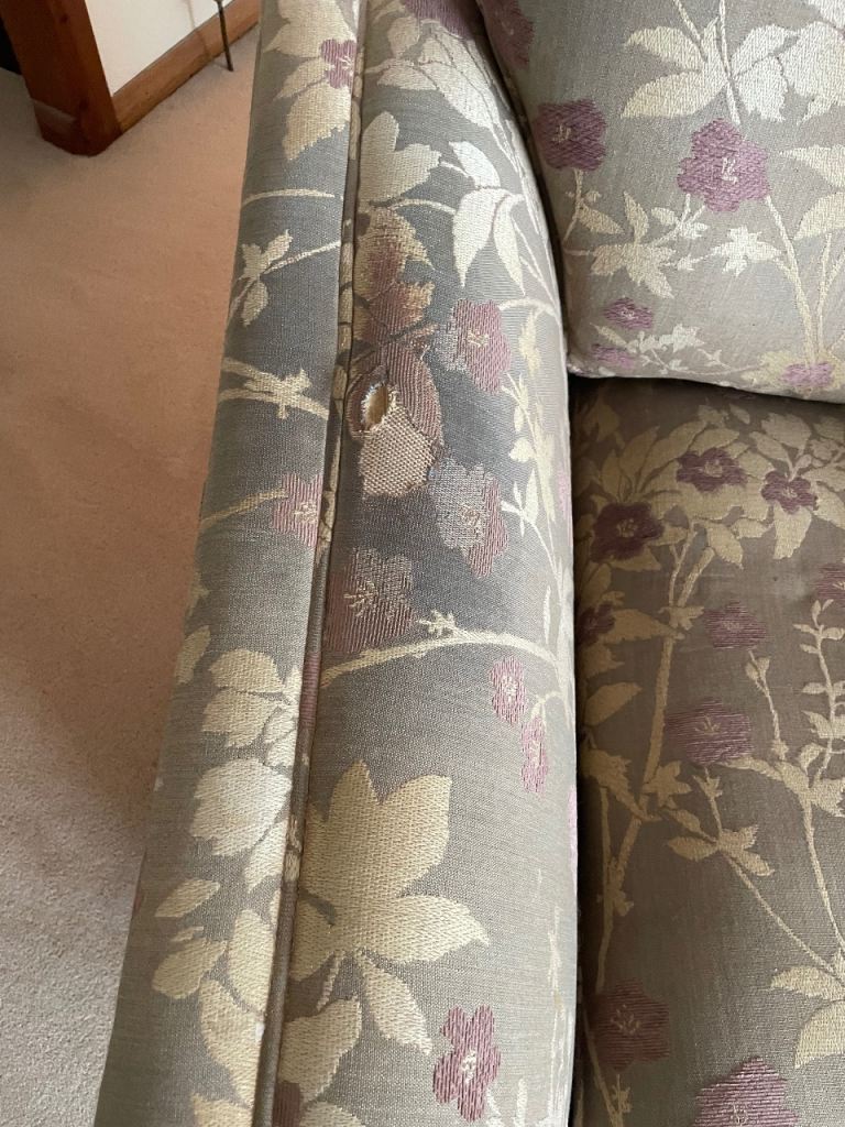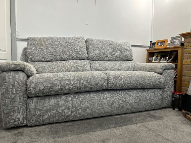 This Parker Knoll Large Two-Seater Sofa and 2 Armchairs set features a comfortable foam filling and a multicoloured blended fabric upholstery. The sofa and armchairs are made with a wooden frame , making them suitable for adults to relax in the living room. With no additional parts or assembly required, this stylish and durable set from the renowned Parker Knoll brand is a perfect addition to any home looking for a cosy and elegant seating option. Sofa and one chair is in very good condition, on other chair is wee hole as on picture.