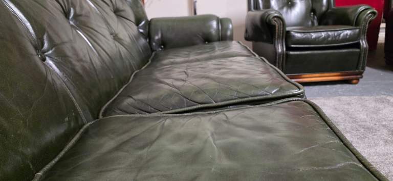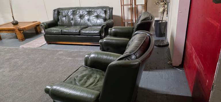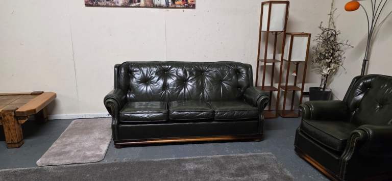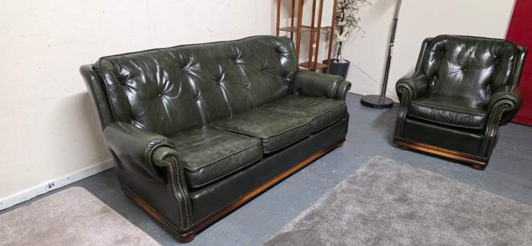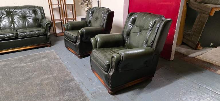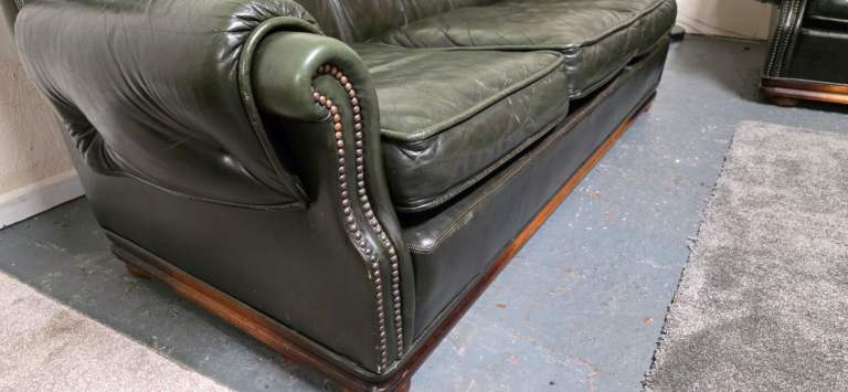 PEGASUS®️ Green genuine leather Chesterfield sofa suite. Solid wood frame. Bases are sprung and cushioned. Also the seat cushions themselves are sprung. Quite rare. Very durable. Will be comfy for many years. PEGASUS®️ Is an exceptional brand. Solid wooden frame with traditional PEGASUS Wood colouring to the fronts. All underneath lining is perfect. Delivery may be possible.