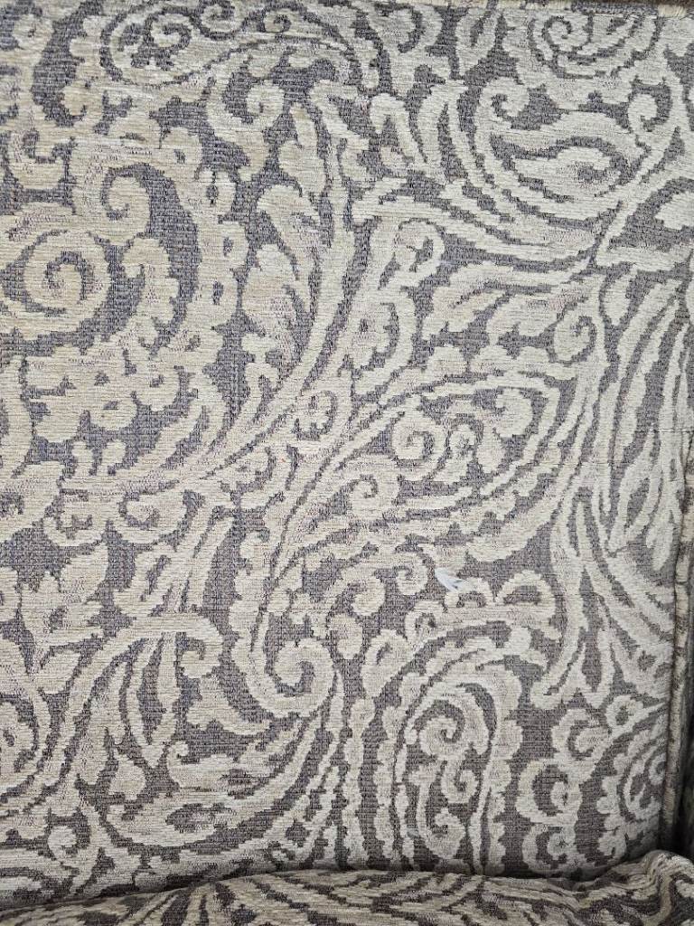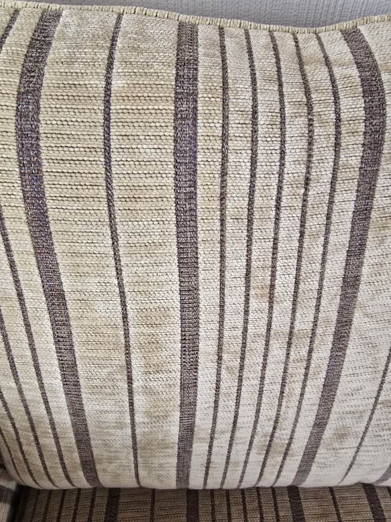 I purchased these sofa's 4 years ago from a quality furniture store '' SOLOMANS Of LISKEARD" the are in good condition and the suite has since been professionally cleaned for the new owners. They are a cream back ground with a dark mauve detail. The cushions are loose and zipped. The quality fabric is hard wearing and nothing flimsey.