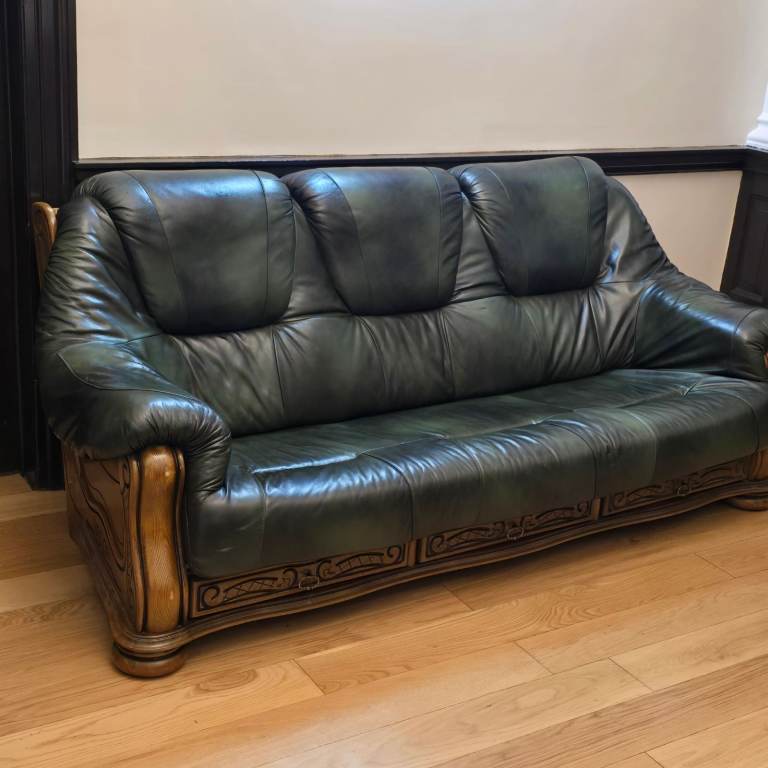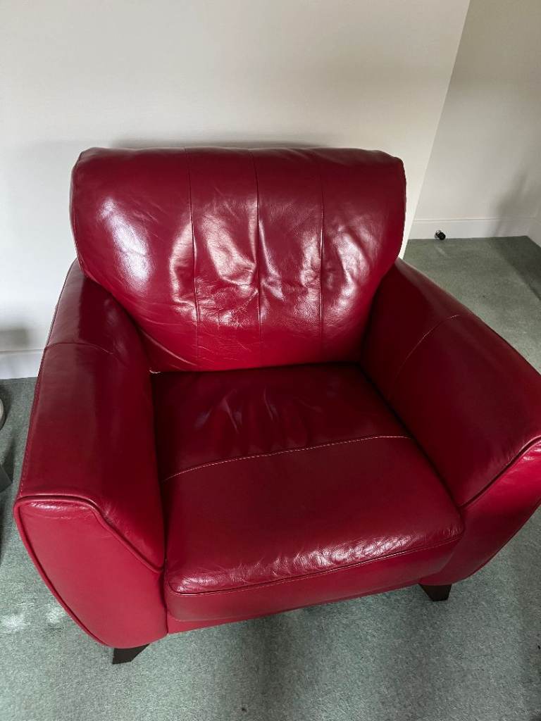 Matching sofa set comprising a two-seater sofa and two armchairs. The seat cushions are all firm, and the set is in good condition. No tears or rips or fraying. Leather has nicely aged with creasing. The legs can come off for delivery. All three items in the set have their original fire retardant leaflets in place underneath.