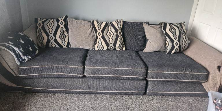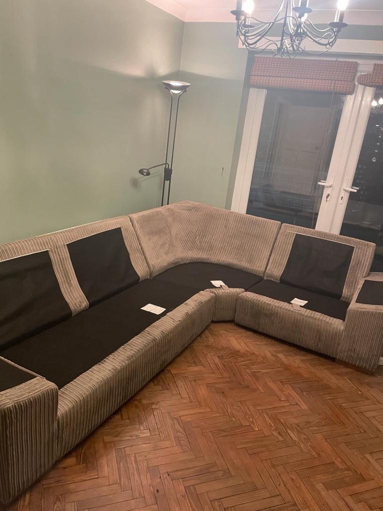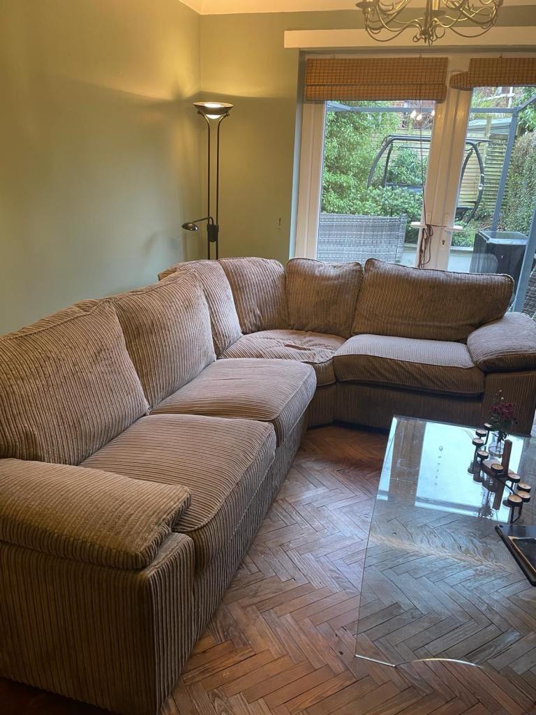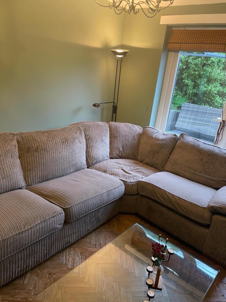 Mushroom coloured right hand corner settee for sale. Seat cushions have been freshly stripped and laundered. In very good condition. Priced to sell. Selling after purchasing a new sofa. Collection only