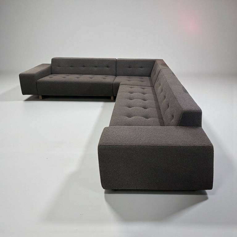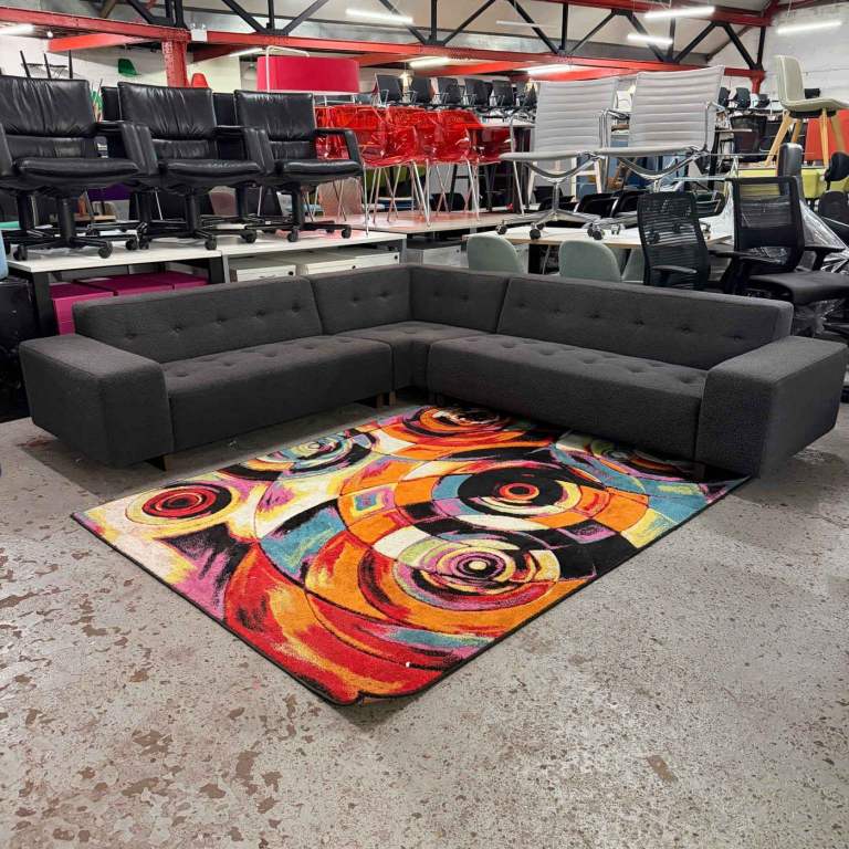 Second Hand L-Shaped Seater Sofa has grey fabric upholstery, deep cushioning, and it is ideal for reception areas, waiting areas, and breakout spaces