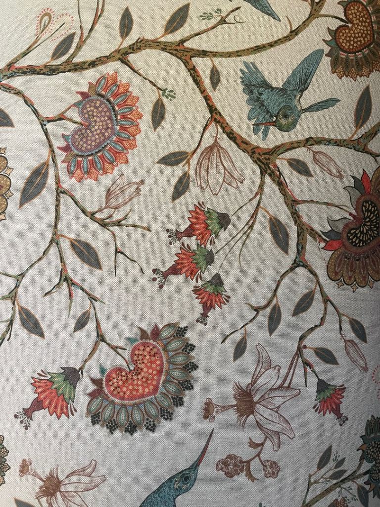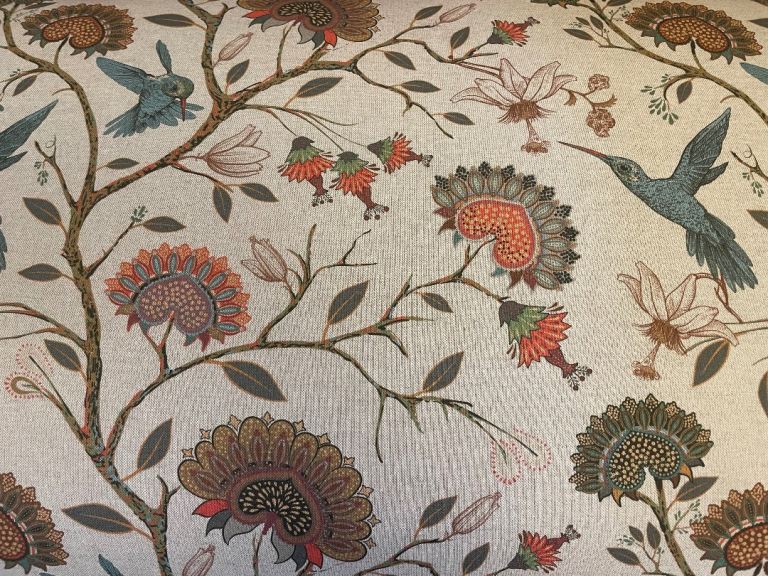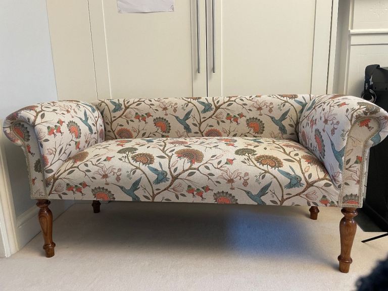 A gorgeous hand crafted occasional small sofa covered in a printed Jacobean design with mahogany legs. Perfect condition.