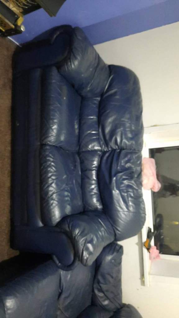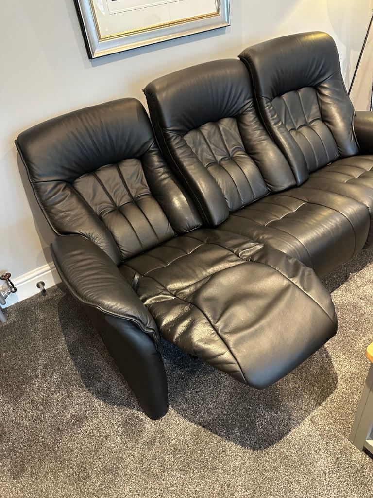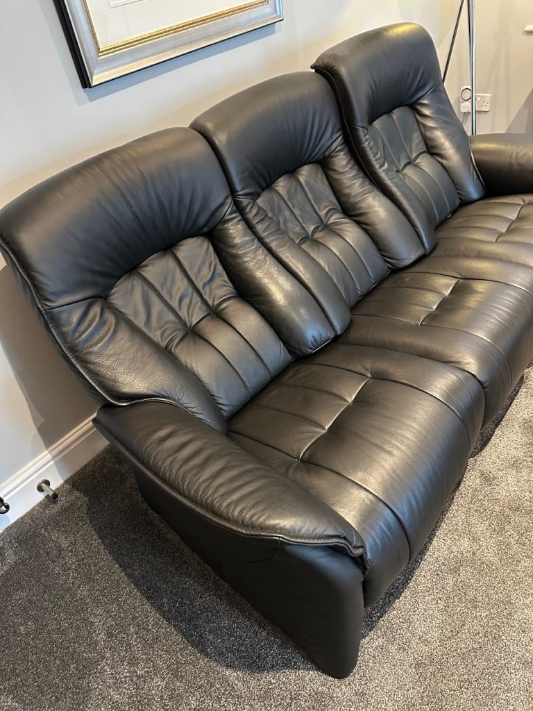 Himolla Rhine Black Leather 3 Seater Manual Recliner. The 3 seats recline individually by use of leather pull straps. They are repositioned upright by pushing with leg or hand. Width 208cm, Depth 92cm, Height 97cm. Smoke free home. Professionally cleaned and polished 1 year ago. This item has a steel frame and is very heavy. It will require strong people and a van. We are unable to assist with lifting.