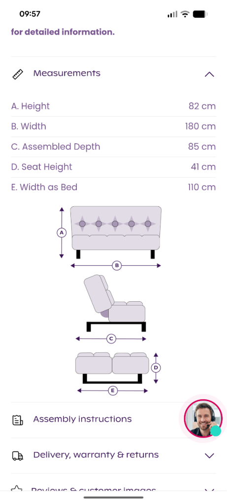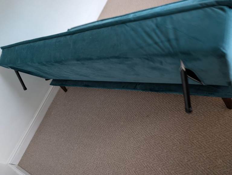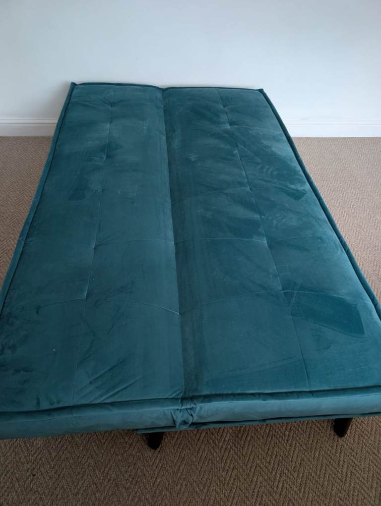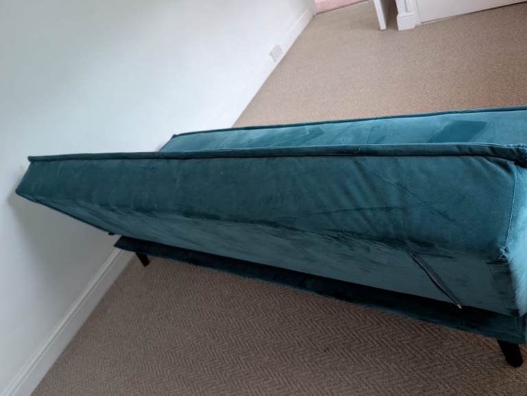 Gorgeous sofa bed, only selling as I'm moved in with partner and have no room. Used literally once as a bed and barely sat on it. Only a year old. £299.99 retail price, selling for £100 but happy to chat about it. Listed as velvet as it's velvet feel but the actual fabric I'm unsure of. It's super easy to clean.