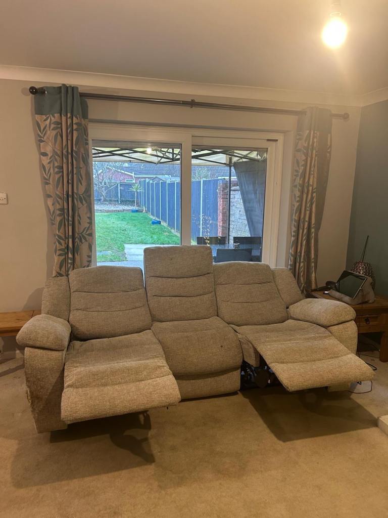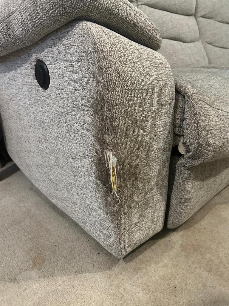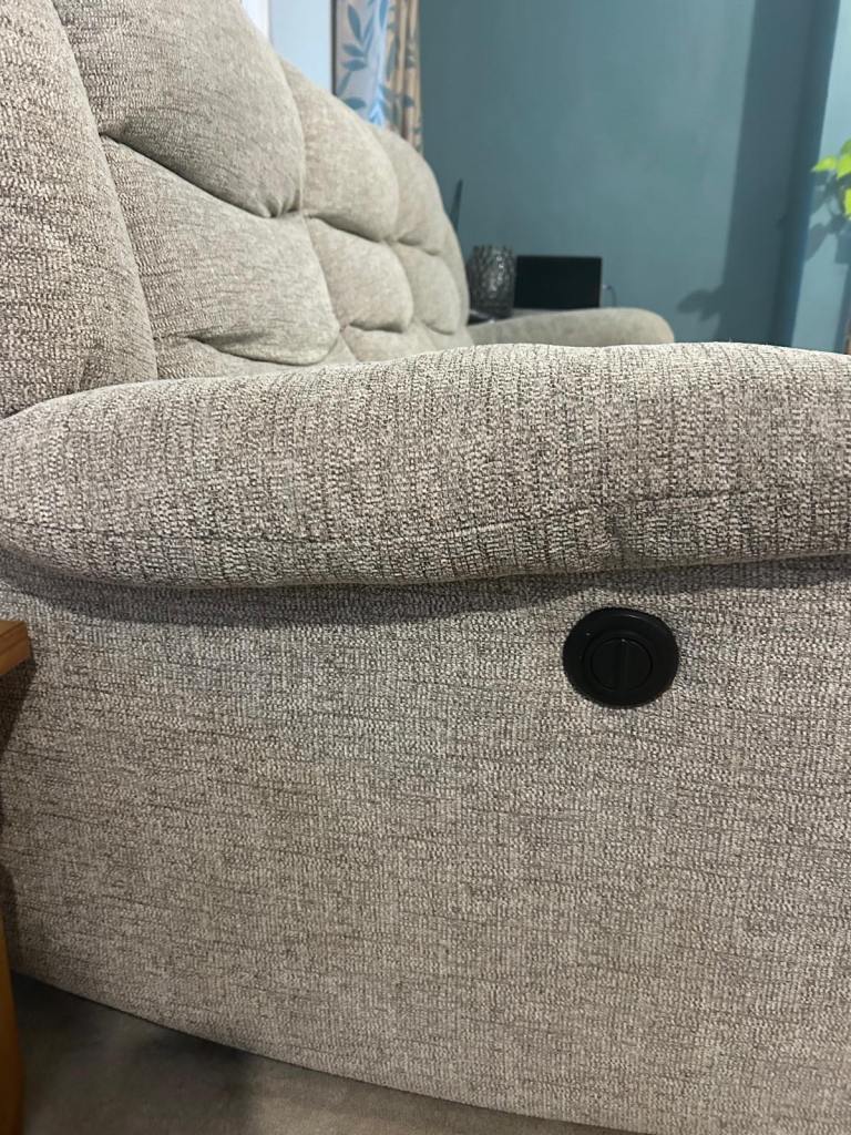 Electric recliner sofa , fabric! Works perfectly. Has cat plucks as in pics . FREE! FREE! Must be collected by 24th February due to house move .