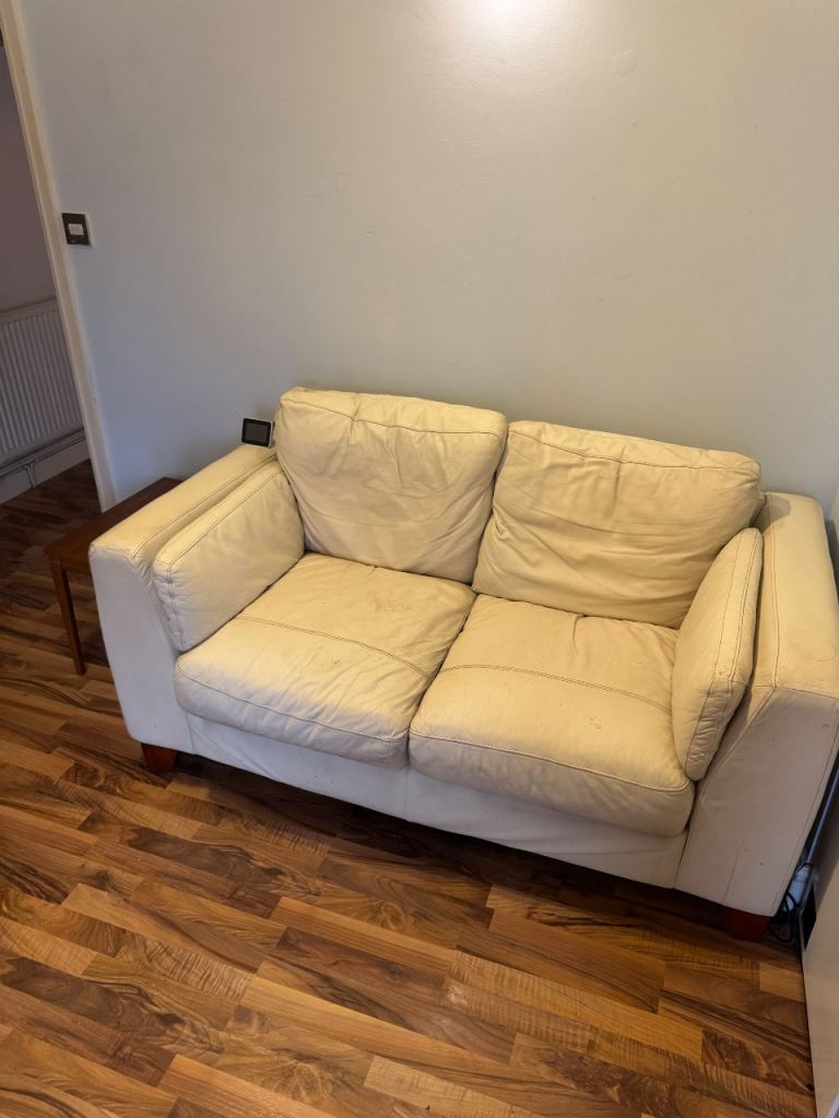 Leather cream sofa, really comfy and nice to sit on. Could do with a clean but apart from that it’s nice
