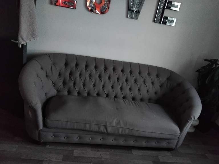 The sofa is upholstered in a high-quality, textured blended fabric that is both durable and soft to the touch. It features a stylish, contemporary design with supportive foam and inner coil seat cushions and fibre-filled back cushions for a comfortable, "sink-in" feel.