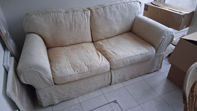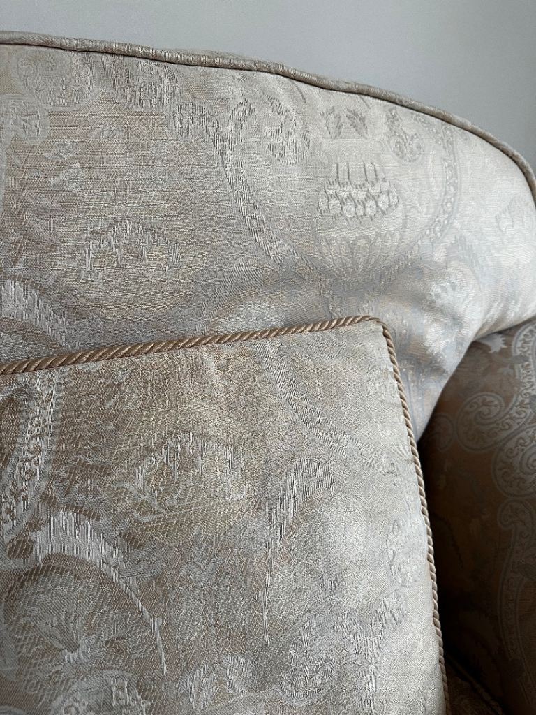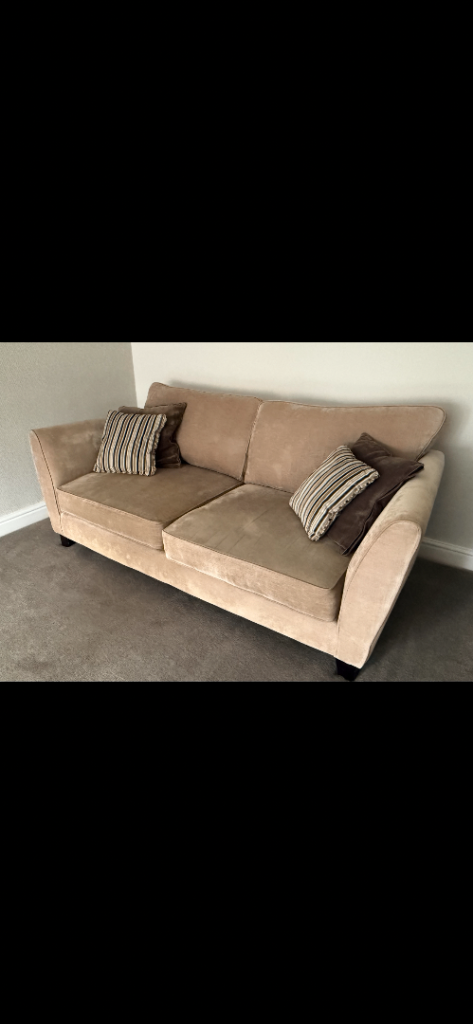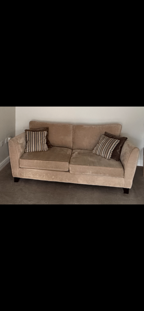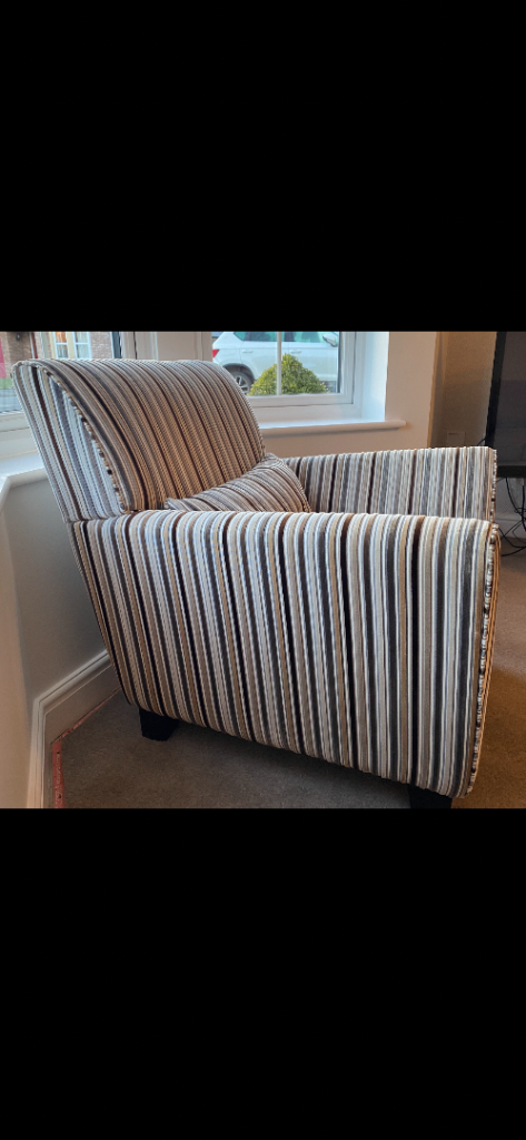 2 matching 3-Seater Sofas in Soft Beige Fabric complete with matching scatter cushions, plus coordinating Stripped Fabric Arm Chair with Dark Wood Feet