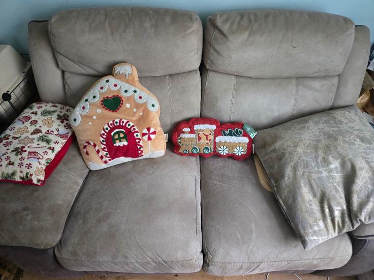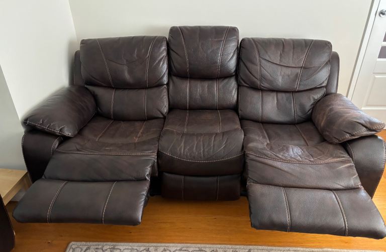 3 seater brown, soft leather sofa with 2 manual recliners.