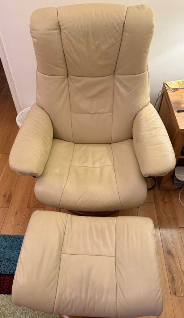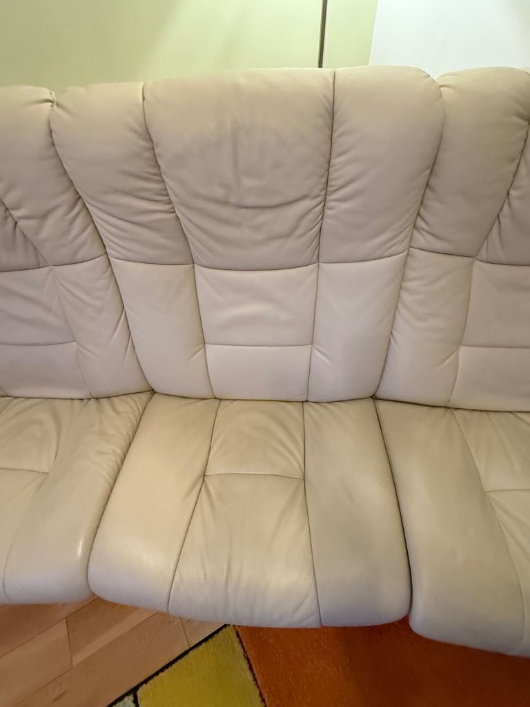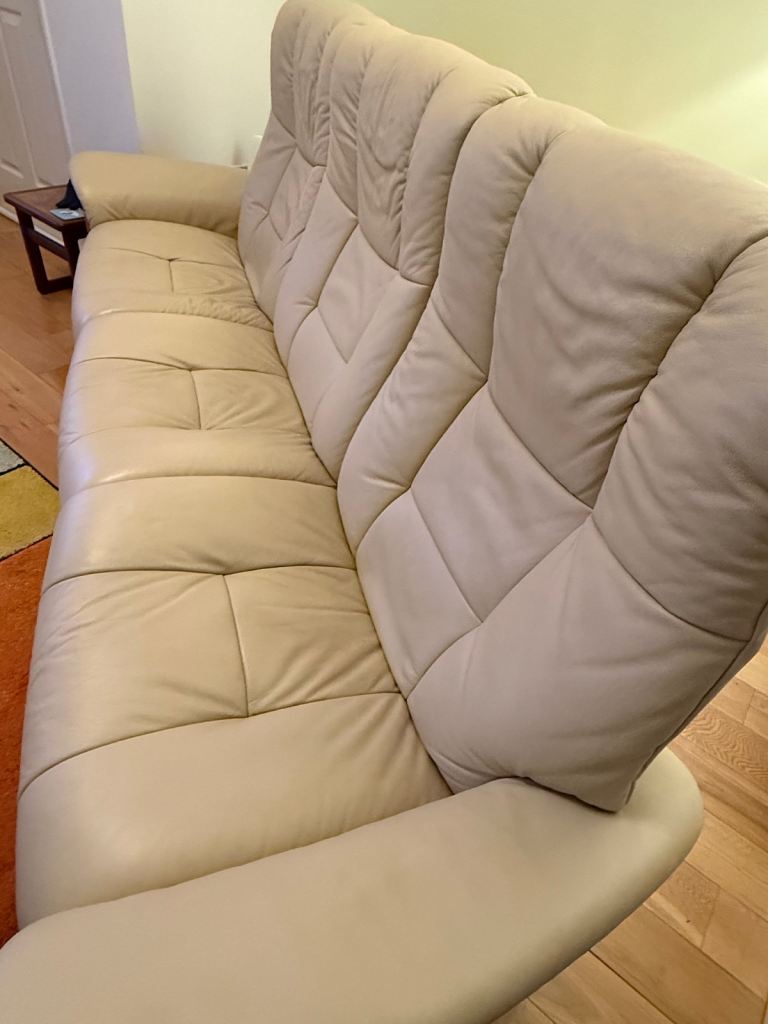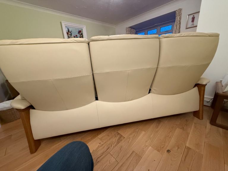 Beautiful Stressless Buckingham 3-seater sofa in cream leather, plus the matching Stressless Buckingham recliner chair and 2 footstools — a complete, premium set.