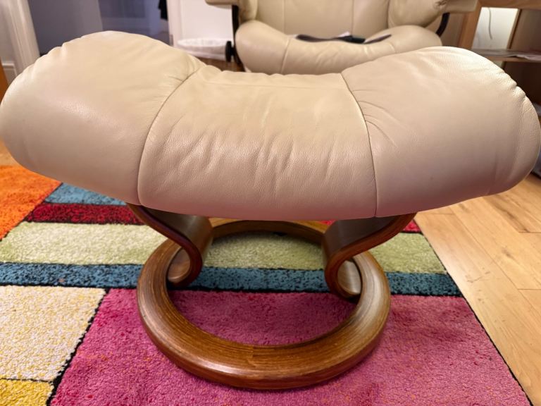 • Footstools (each): approx W55 cm × D41 cm × H42 cm (typical Stressless ottoman size)