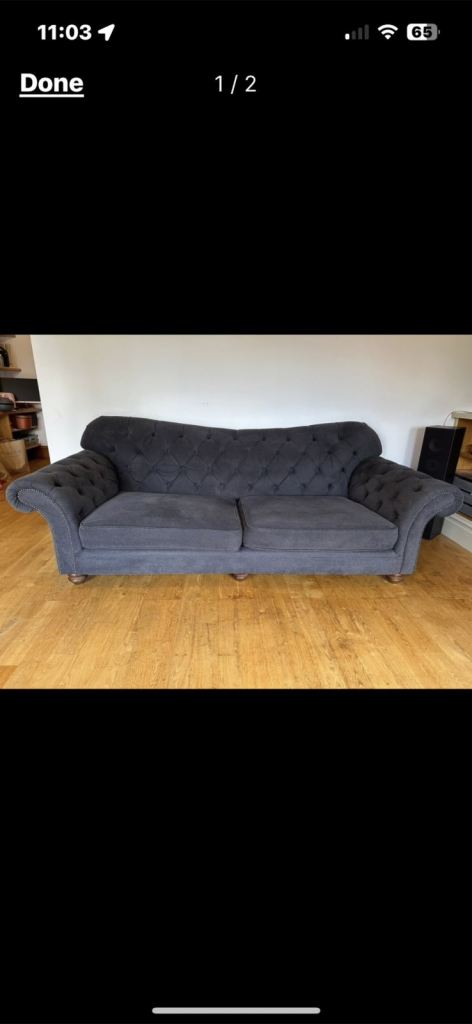 Need gone ASAP!! Stunning solid Dark Grey 4-Seater Chesterfield Sofa! 2 years old, very good condition, all washable ..wide spacious seating..originally paid £1600.