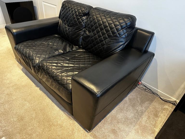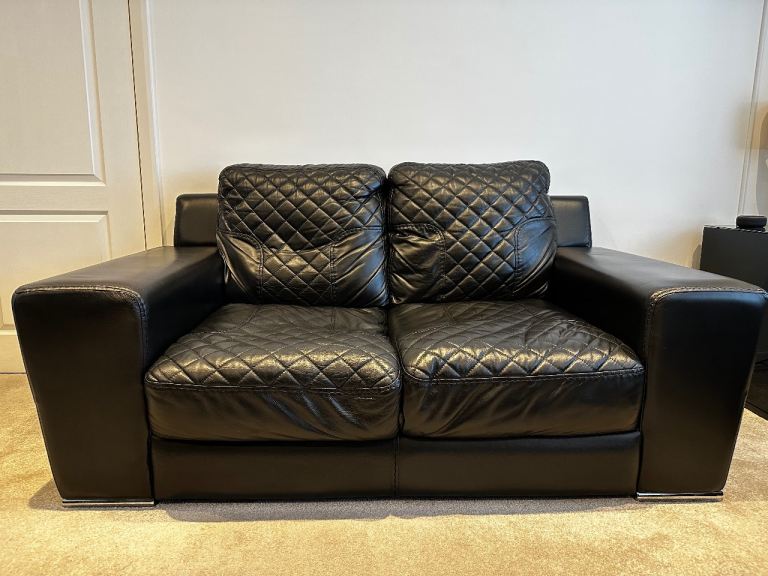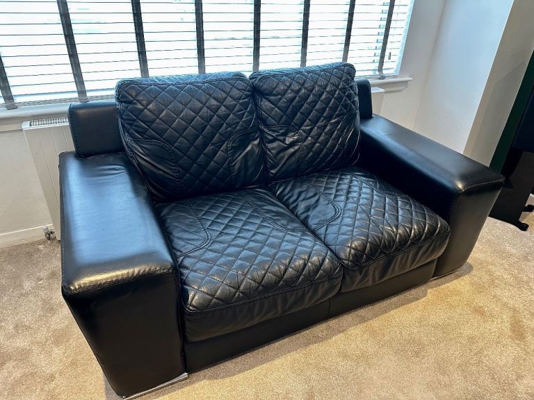 Stylish black leather 2-seater sofas with matching armchair in great condition
