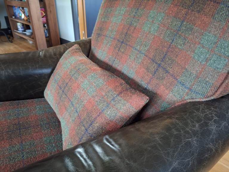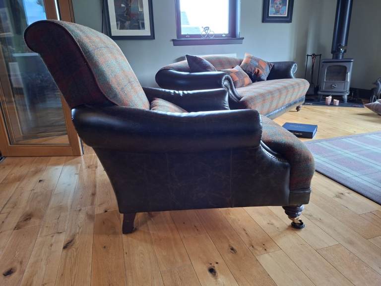 Posting for 8+ yearsTetrad Harris Tweed Taransay Gents Chair Forrest check with walnut leather and mahogany legs