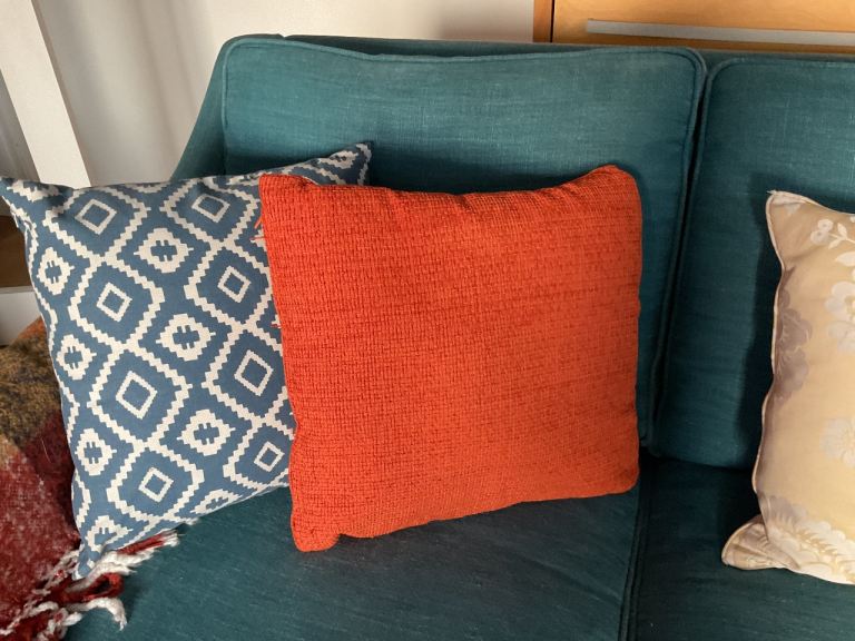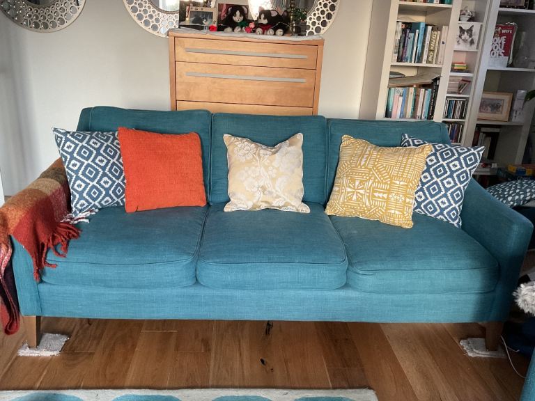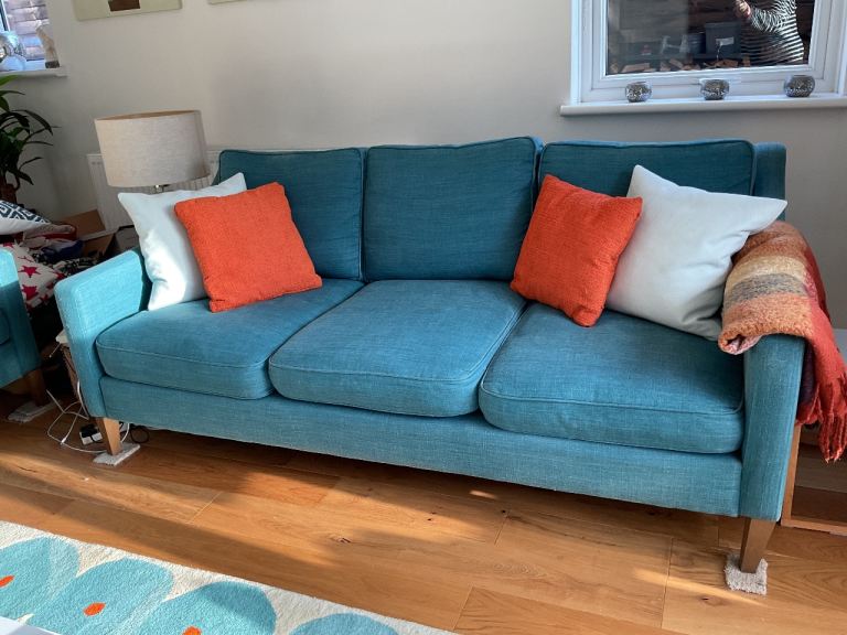 TWO 3 Seater Sofas in Teal Linen in good condition, style is called IGGY, quite contemporary. There are a few minor marks to them and a few cat scratch marks but not to cushions. Throws and cushions are not included.