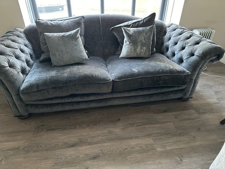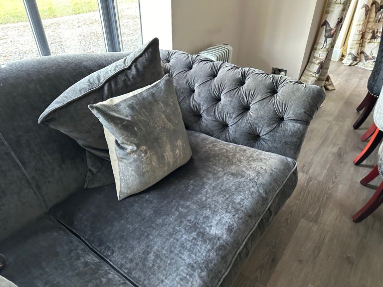 Grey chenille sofas with button arms