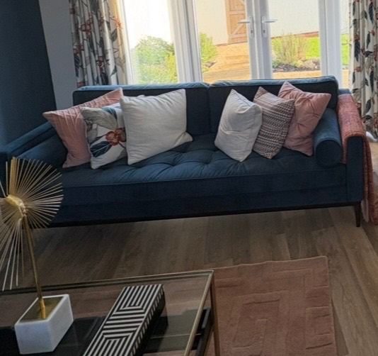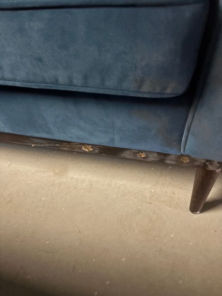 Two Swyft large Model 02 sofas in indigo blue velvet. One has been repaired on the leg and one has a small hole in the back hence the low price