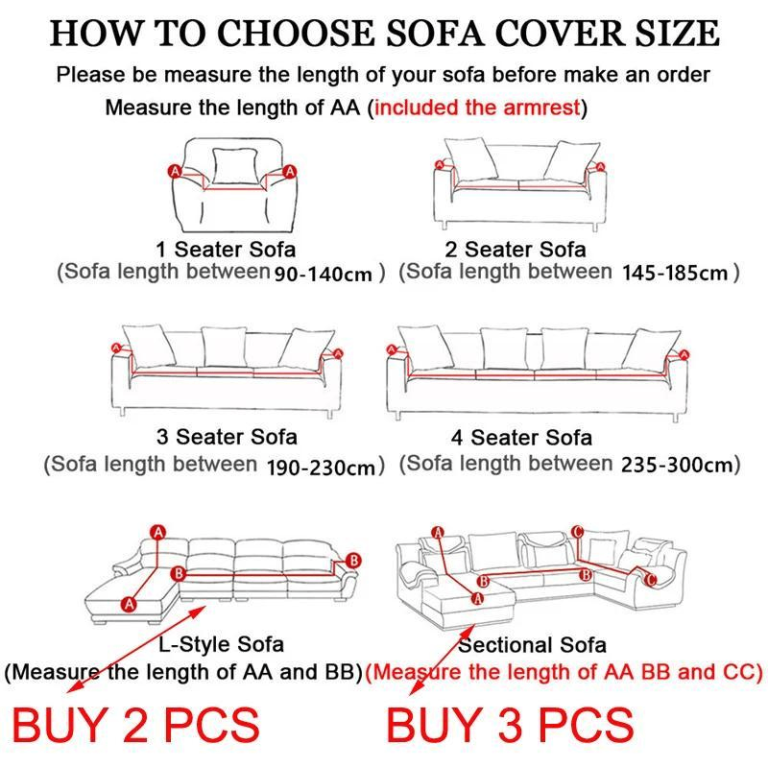 Size Description Purchase Note L shape need to cover separately.so measure the lengh of AA BB.Then we can decide which size to choose for each part.you need to buy totally 2 pieces,each size on the page just contains 1 piece.