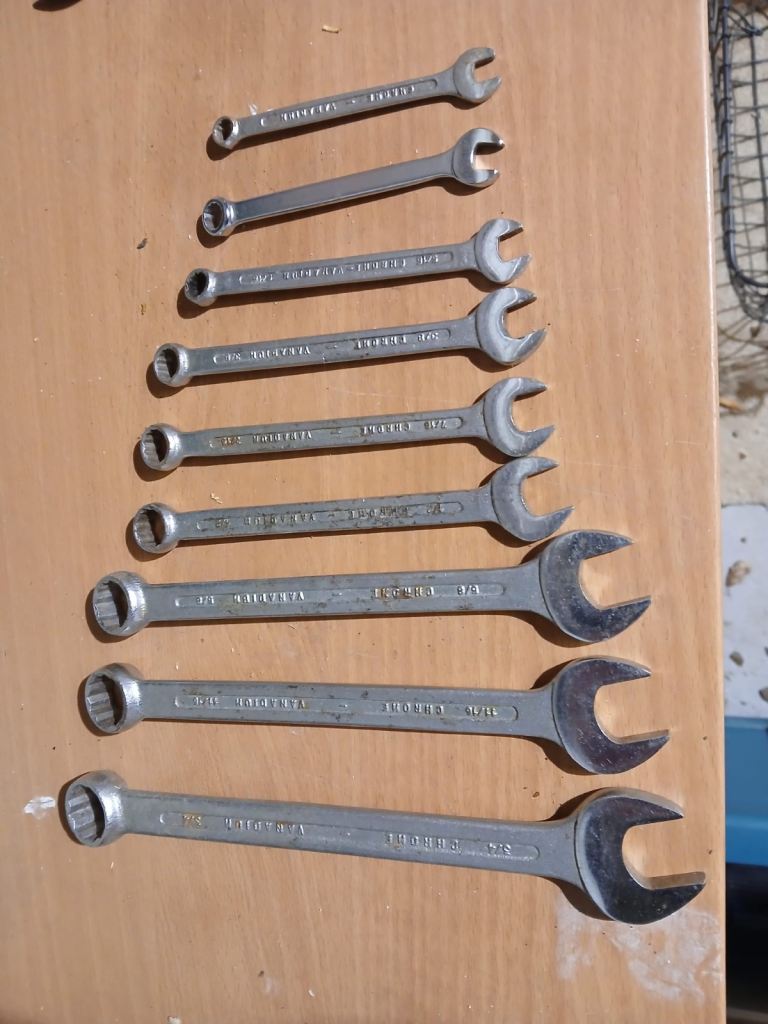 A nice wee selection of metal spanners. Open-ended spanners 19mm to 3mm. Ones with the ring are imperial. 3/4in to 1/4in