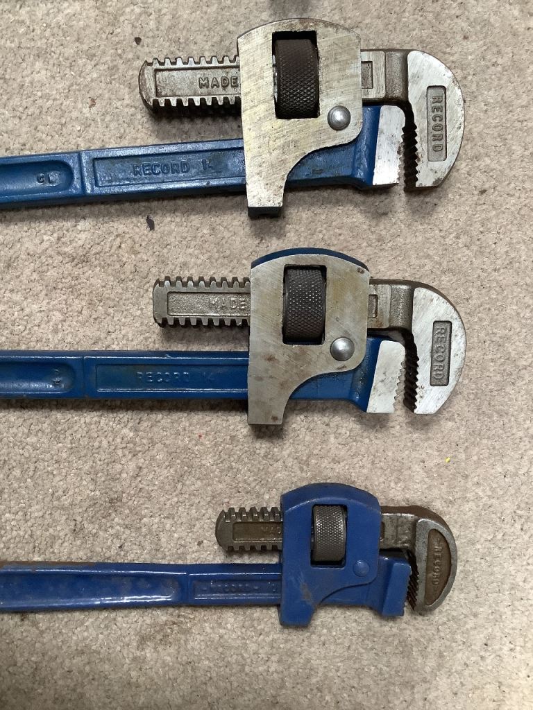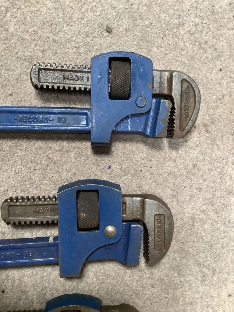 Set of 5 Record heavy duty professional grade pipe wrenches in very good used condition. Set comprises of 2 x 18, 2 x 14 and 1 x 10 inches. These are in good clean condition and have been kept oiled up so ready to go to new home.Set of 5 only £30