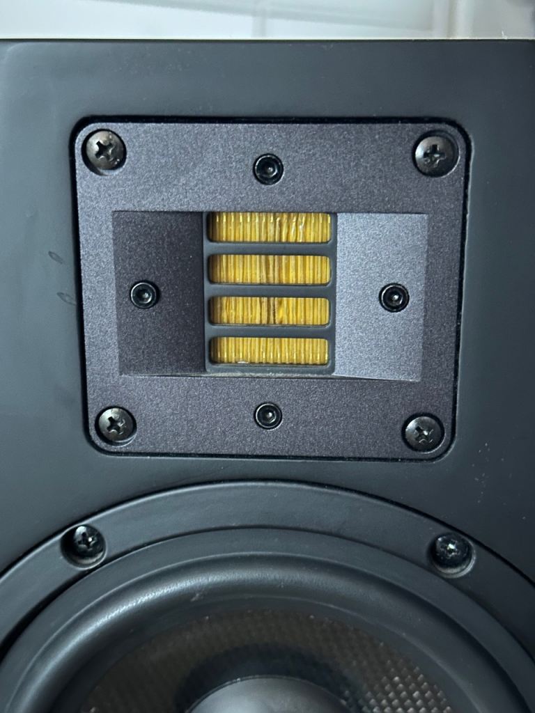 Attaching pictures to show condition. One tweeter showing a little difference to the other which was due to me dusting years ago and not realising how thin the material was but makes absolutely no difference to playback.