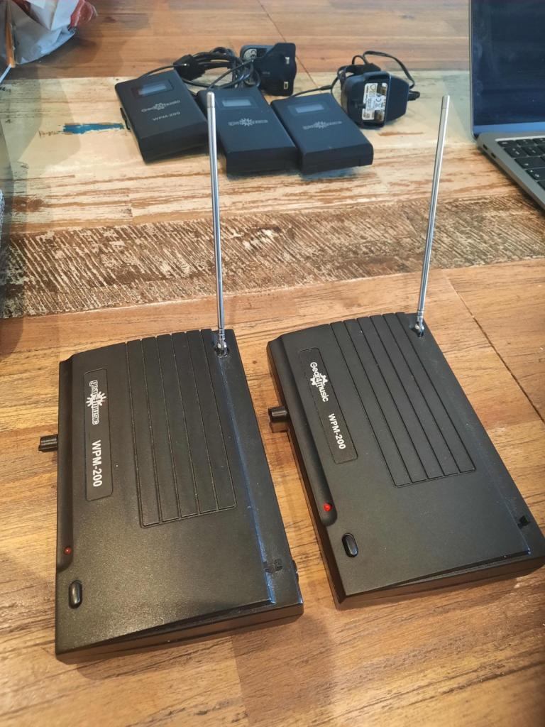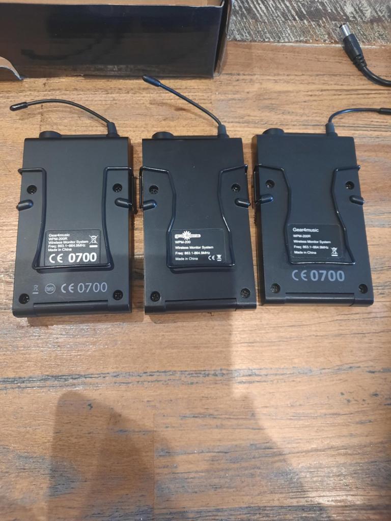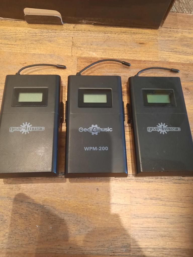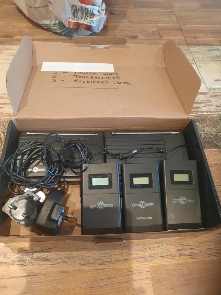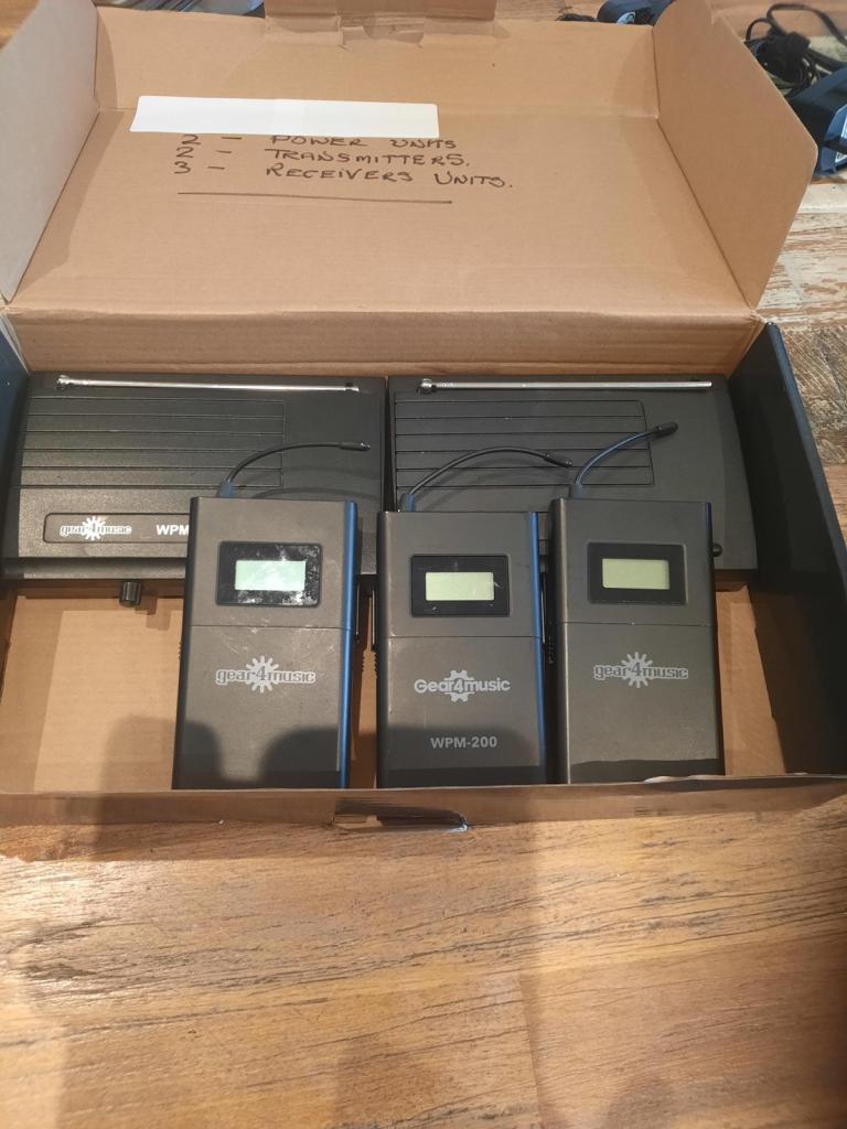 IN ear monitor system, 2 transmitters, 3 receivers, 2 power units. Only been used twice, couldn't get used to them and we went back to having speakers as monitors. These have been sitting in my house for about 2 yrs now. They are in great condition....get the lot for a bargain....