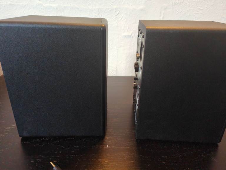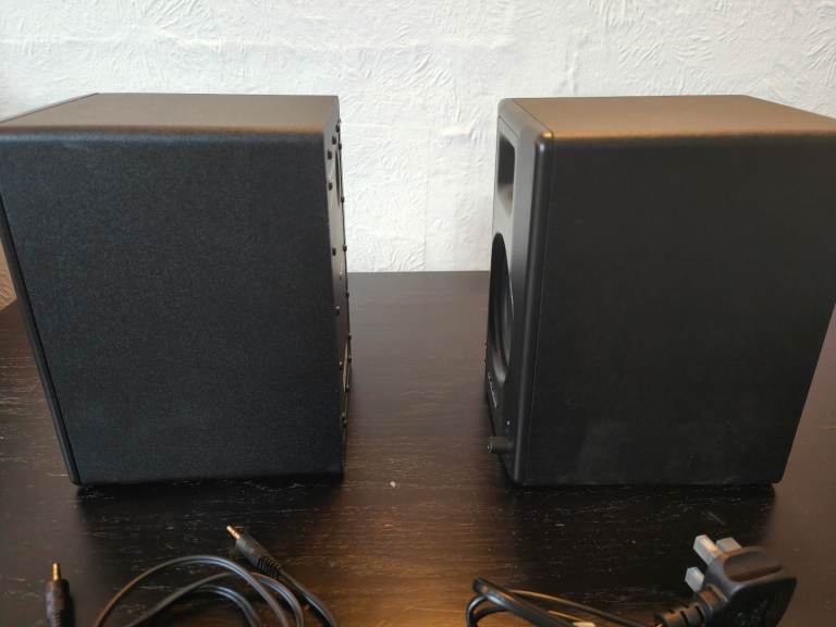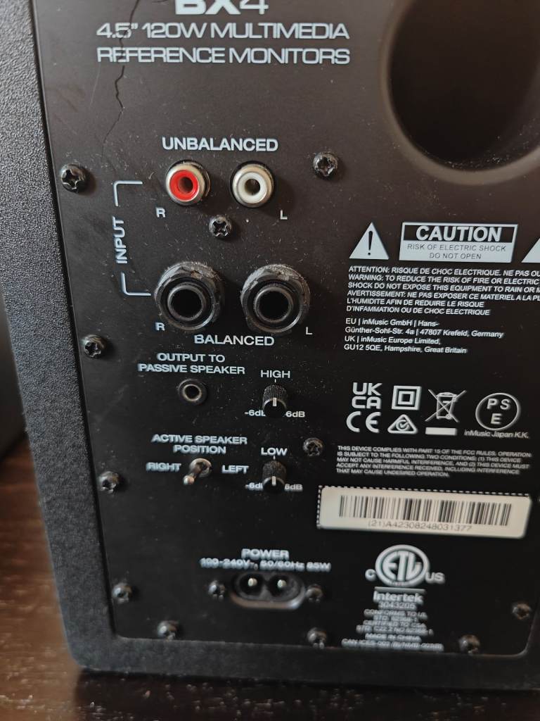 Fully functional, the powered unit has a small crack on the back, which does not effect performance, has balanced and un balanced inputs, high and low EQ adjustment.