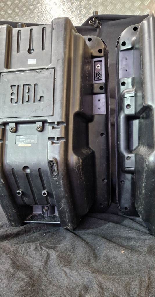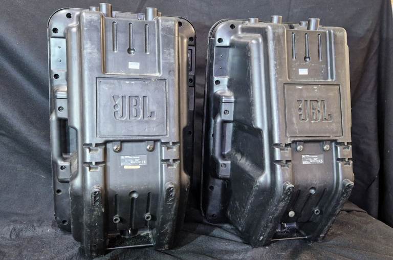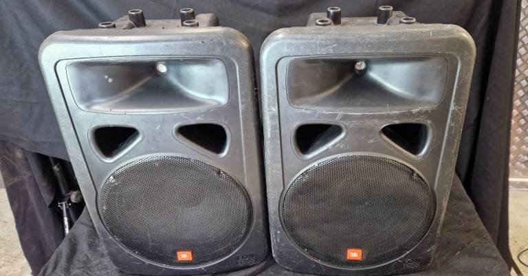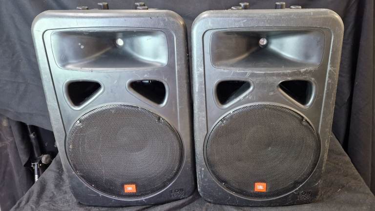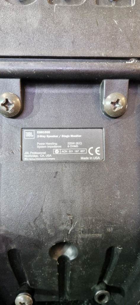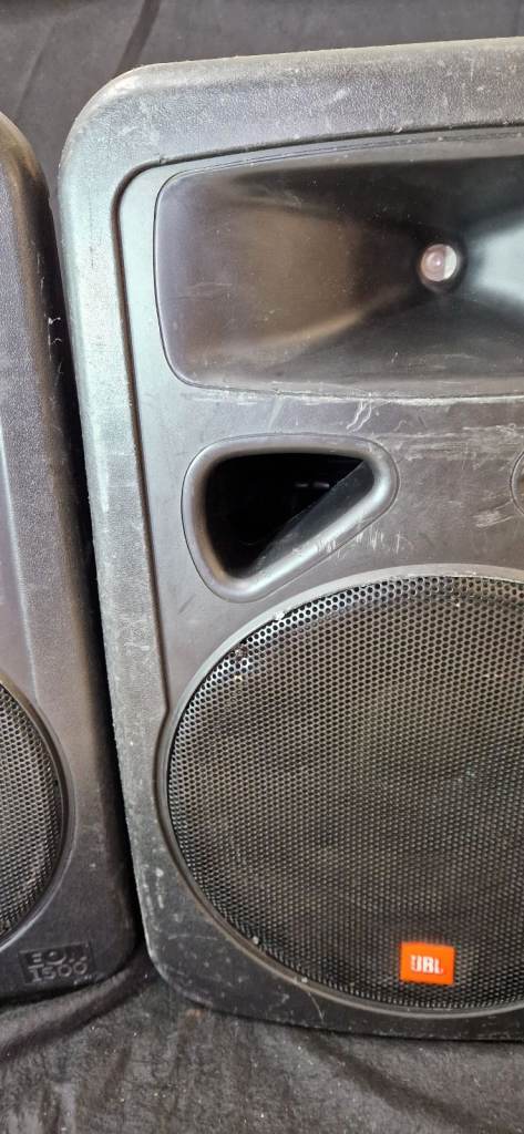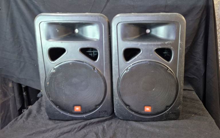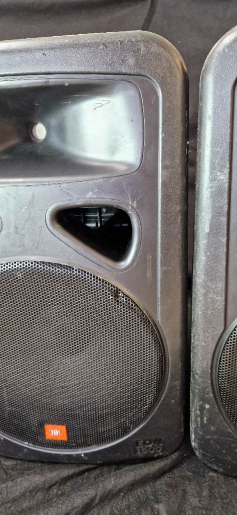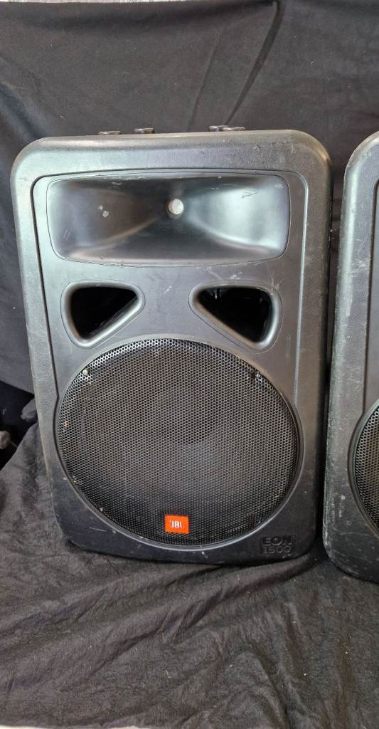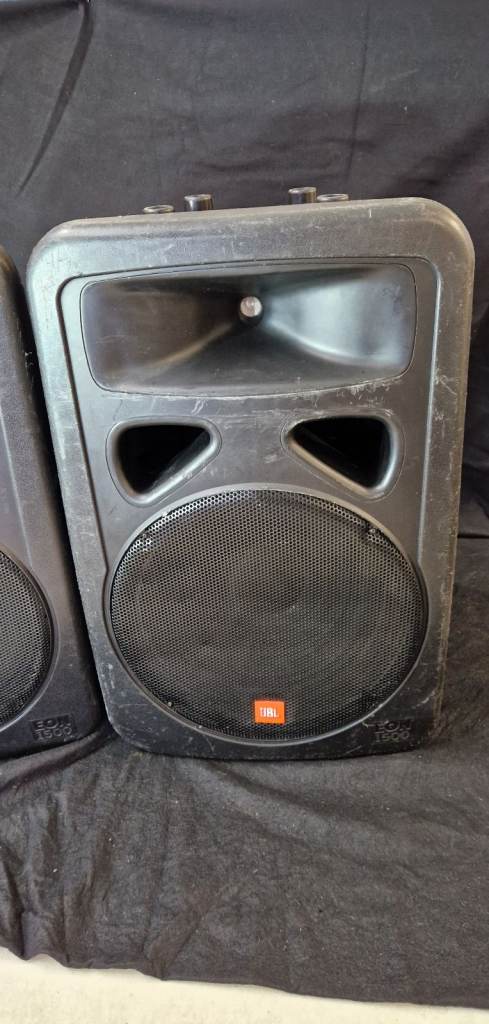 Used pair of JBL EON1500 2-way passive speakers, professional stage monitors designed for DJs and musicians.