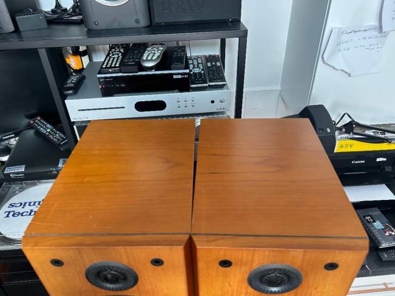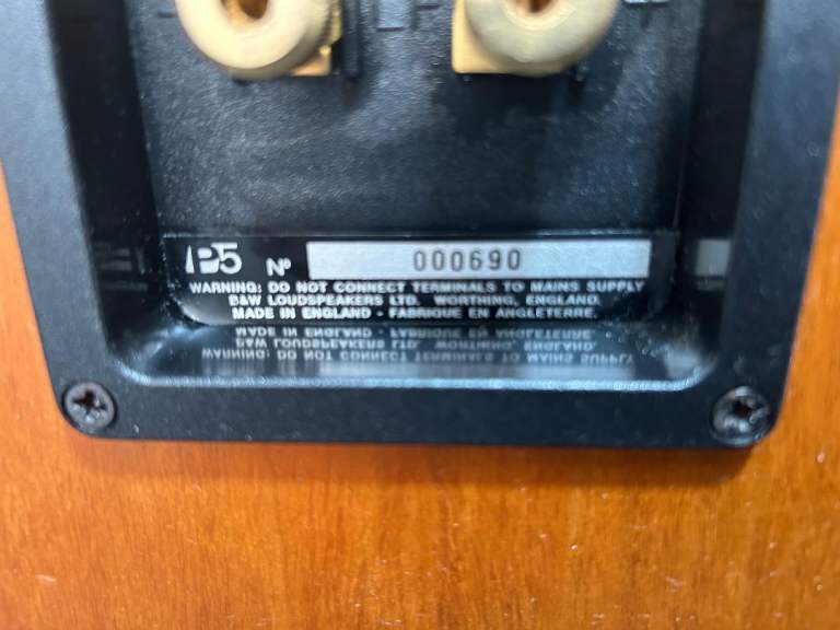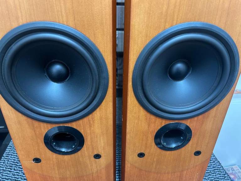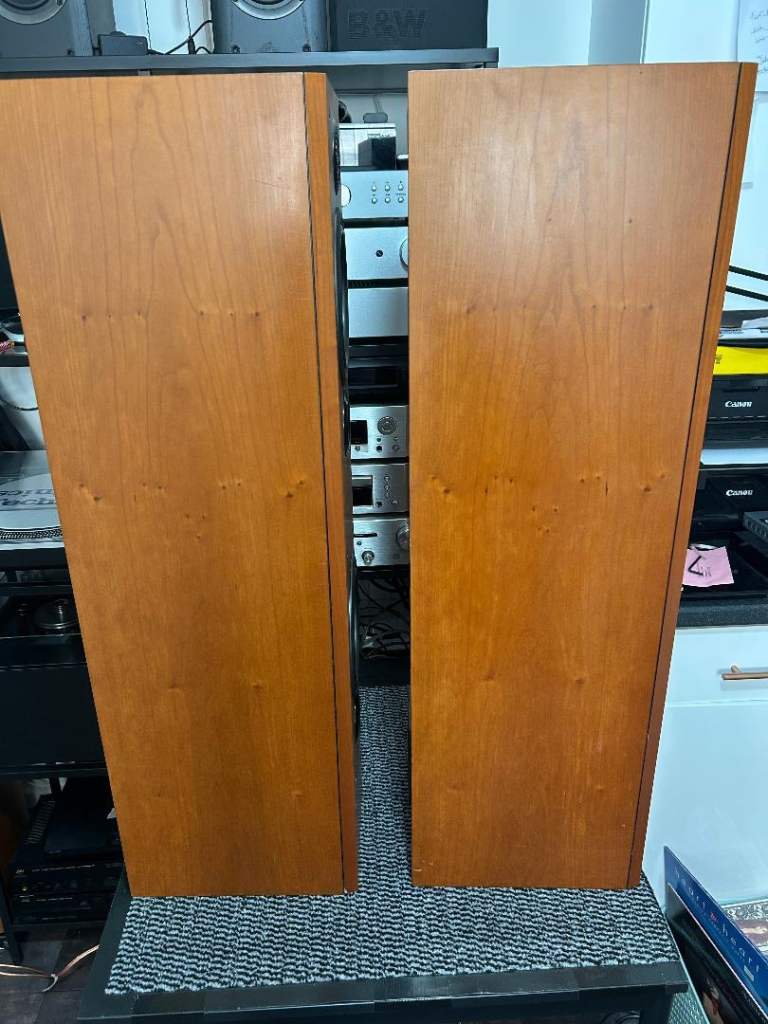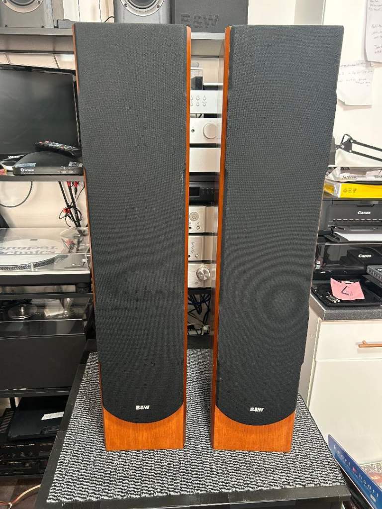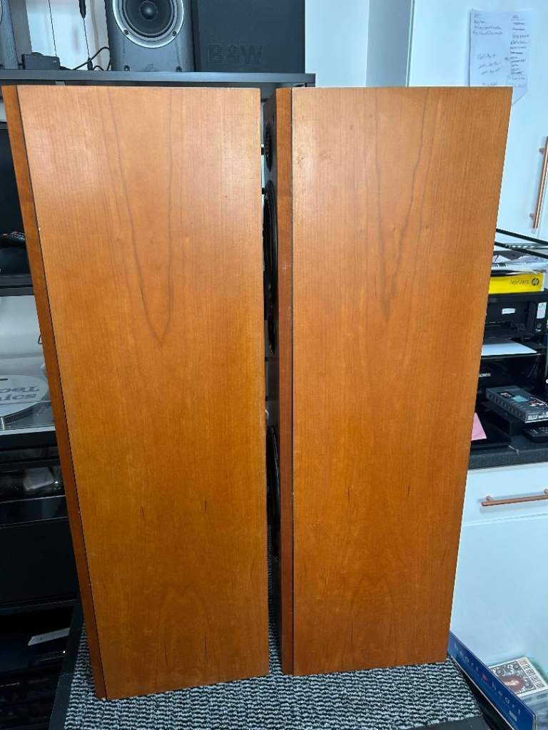 SOLD, PENDING COLLECTION. B&W Bowers & Wilkins P series P5 floor standing speakers in cherry wood. These were in the middle of B&W's range of speakers when they were released, a step up in quality from their DM/600 range at the time. All drivers (including tweeters) are working properly and have no damage or dents. Cabinets are also good condition with only small marks, no damage. Front covers are also good condition. One of the bi-wire links has been replaced with a small piece of decent speaker cable. Demonstration is available on collection. Please see my other listings also.