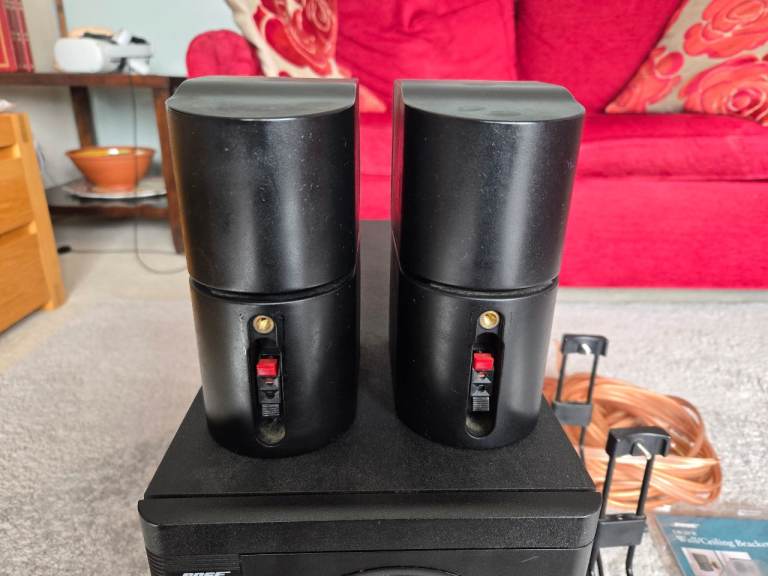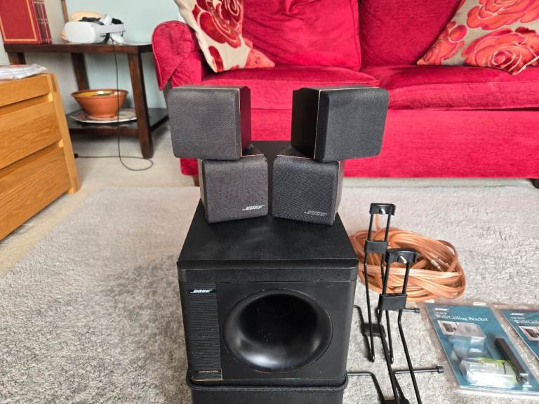 I am selling my Bose Accoustimas 5 Series II speakers. I bought them new and they have always been superb. Rated at 10w - 200w per channel. They come with original Bose stands and wall mounting bracket kits, plus speaker cables. The glue that holds the front port in place on the sub failed a couple of years ago so I used a bungee to hold it in place which has worked really well. They are in good condition for their age with a couple of marks you would expect to find on used speakers.