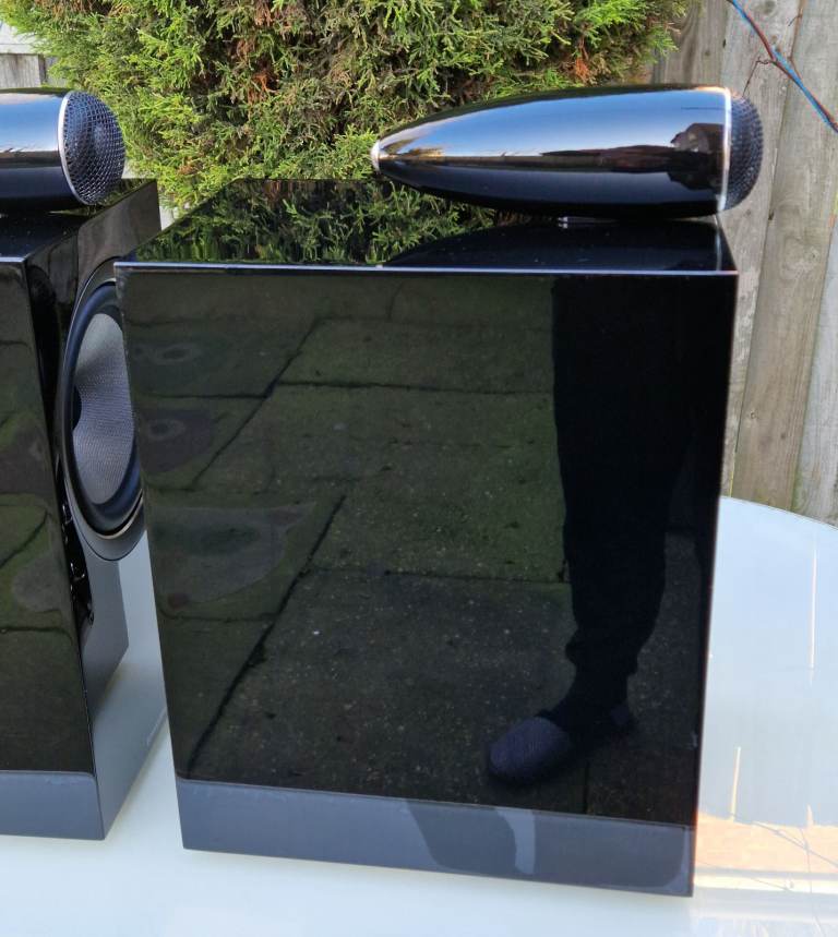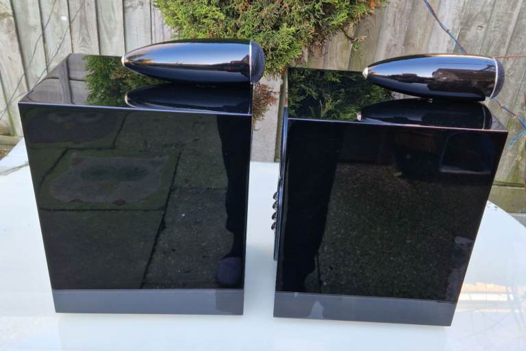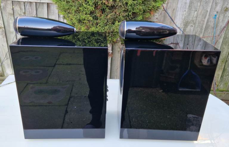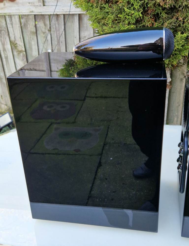 The speakers are in great condition however they do have superficial marks present, impossible to capture in the photos, gloss paint is mirror like. A small chip on the front right edge on one speaker, a couple more at the back bottom speaker.