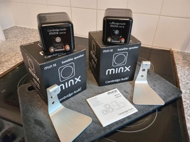 2 x speakers in total, black gloss finish, bmr technology, in original boxes, 2 x cambridge audio table top stands in original packaging, all in great condition, sorry no offers on price