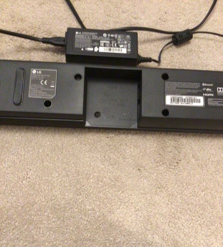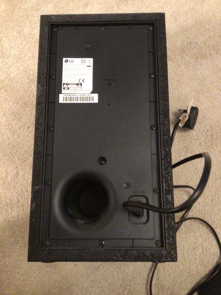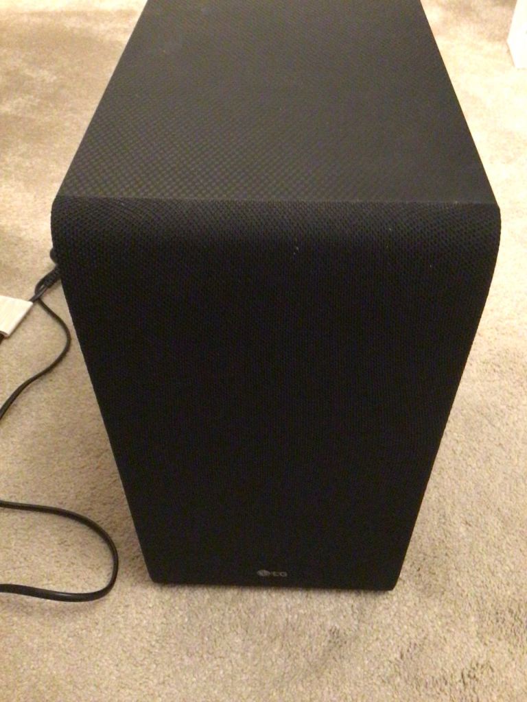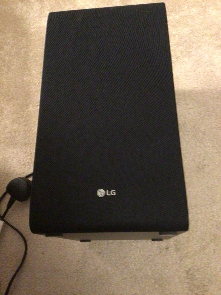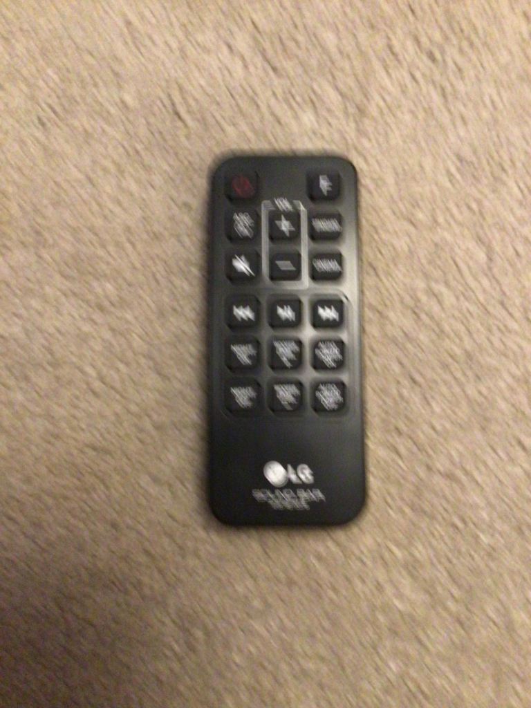 LG soundbar, subwoofer and remote control.