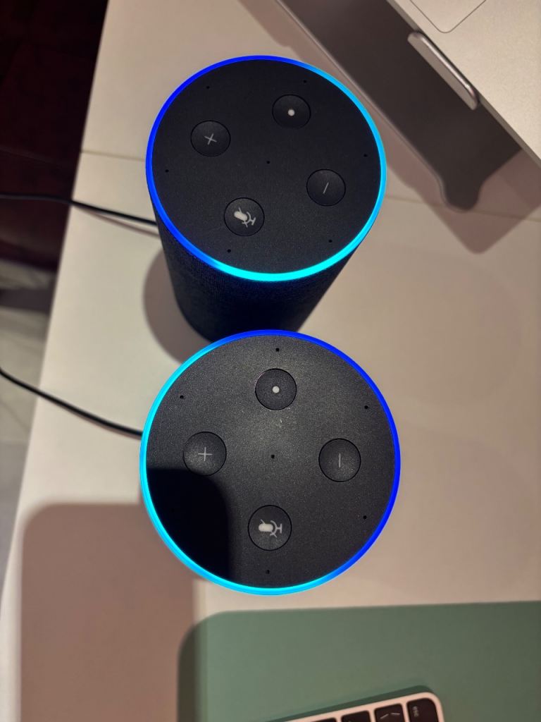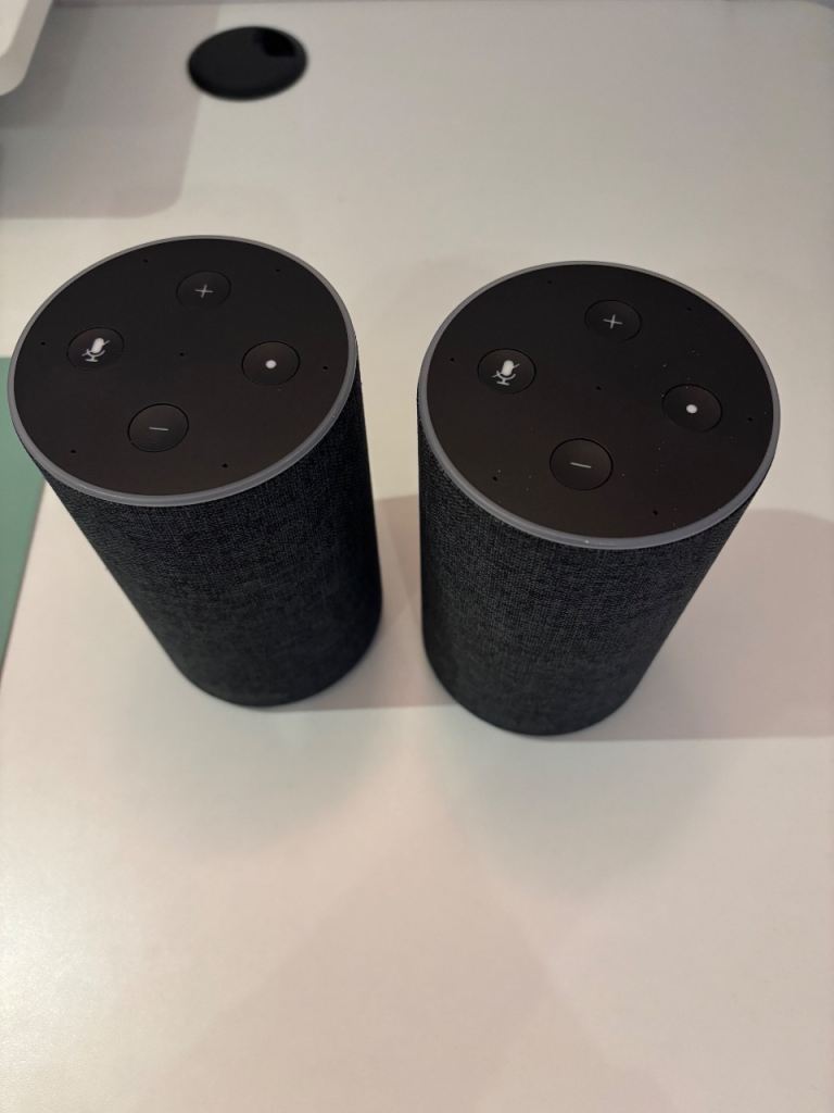 2 x Amazon Echo (2nd Generation) smart speakers in perfect working condition - similar to newer models but at a much lower price.