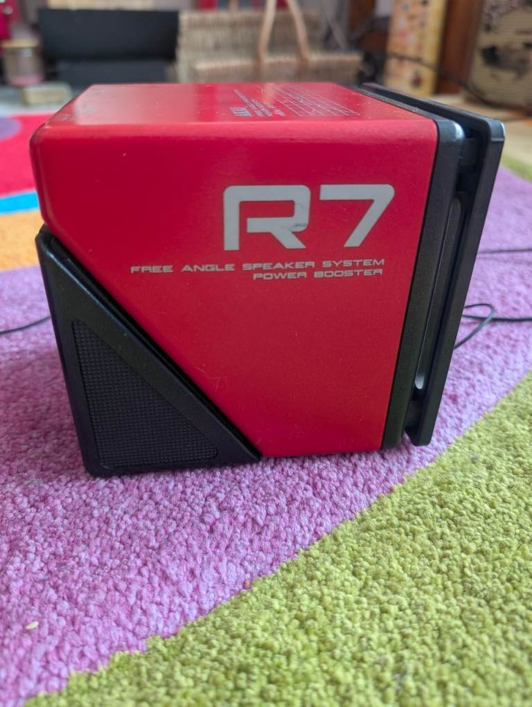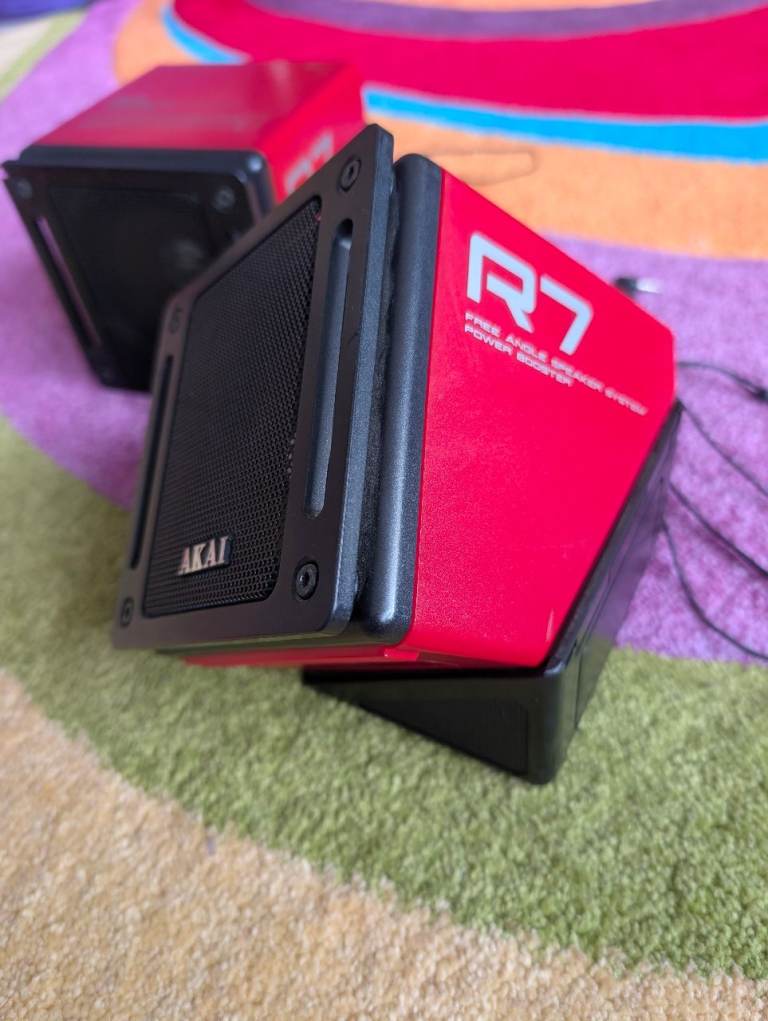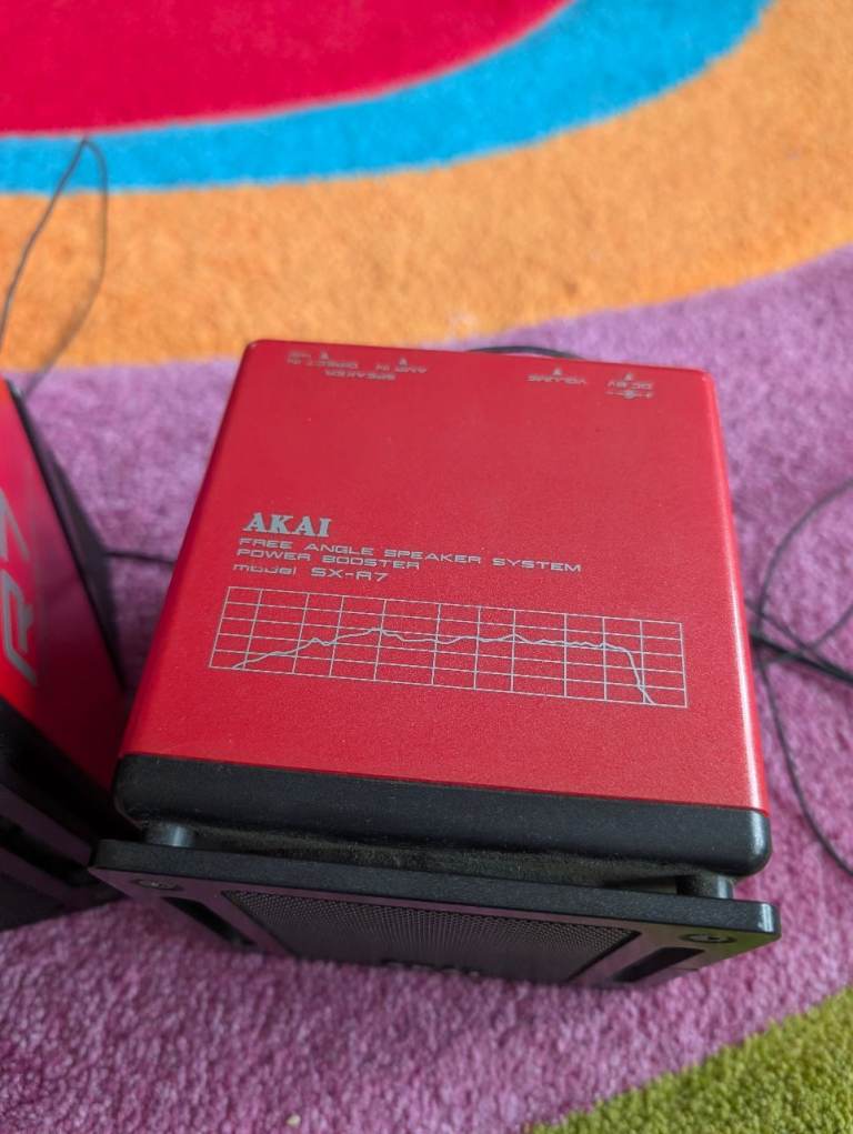 For sale is a pair of iconic Akai SX-R7 "Free Angle" Speaker Systems in a striking retro red finish. These are classic pieces of 80s audio engineering, originally designed as power boosters for personal stereos and mini-hifi setups.