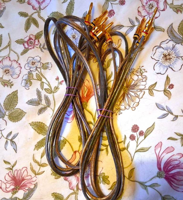 A stereo pair of cables, each 2.65 metres long. The cables are used and have some bits of old paint on from when I was decorating, but nothing too bad. The gold plated banana plugs are brand new and freshly fitted. Markings on the cables say "Speaker cable; Transparent; 2x2.5mm" Decent quality stuff, a nice cost effective upgrade from basic skinny wires. Price is for collected, but could post at cost.