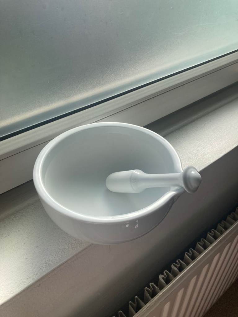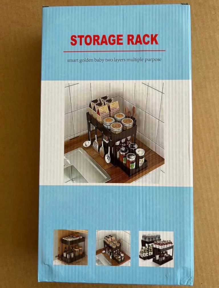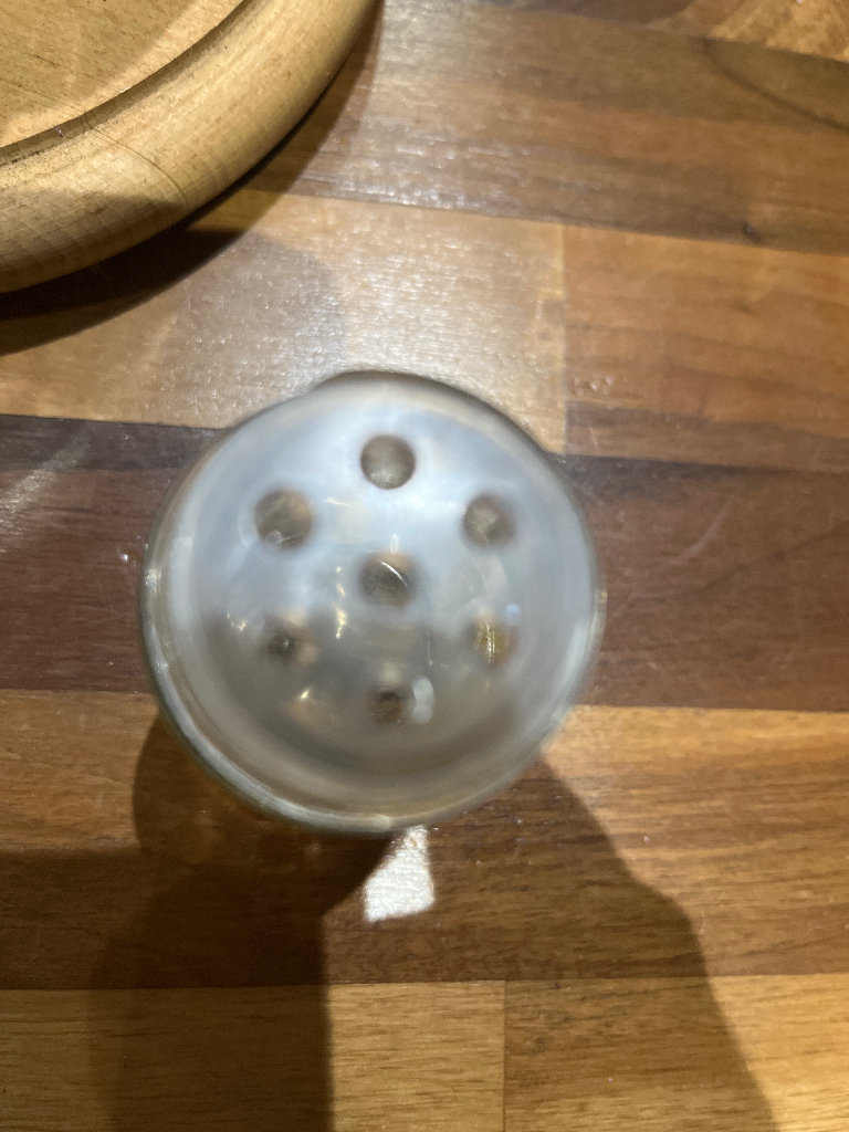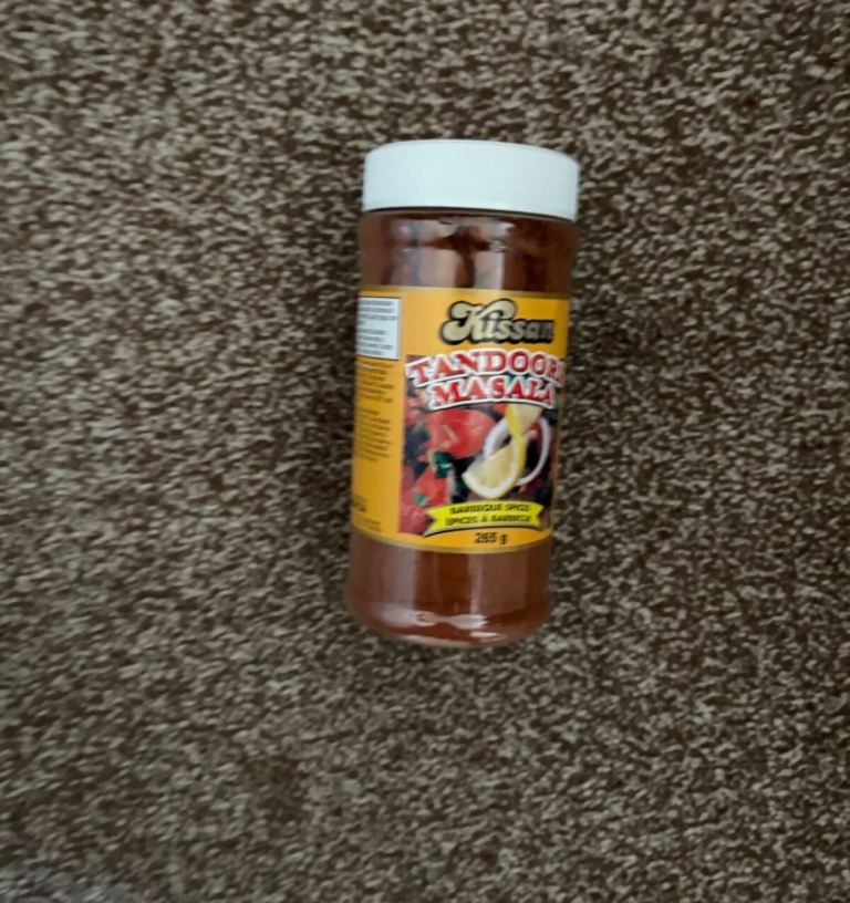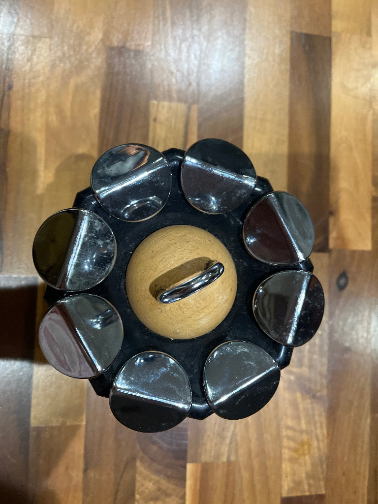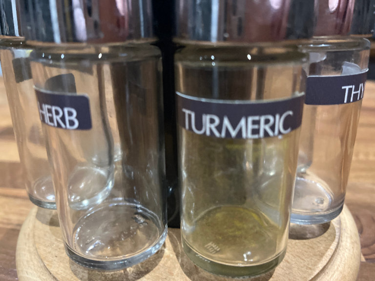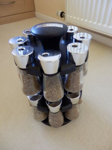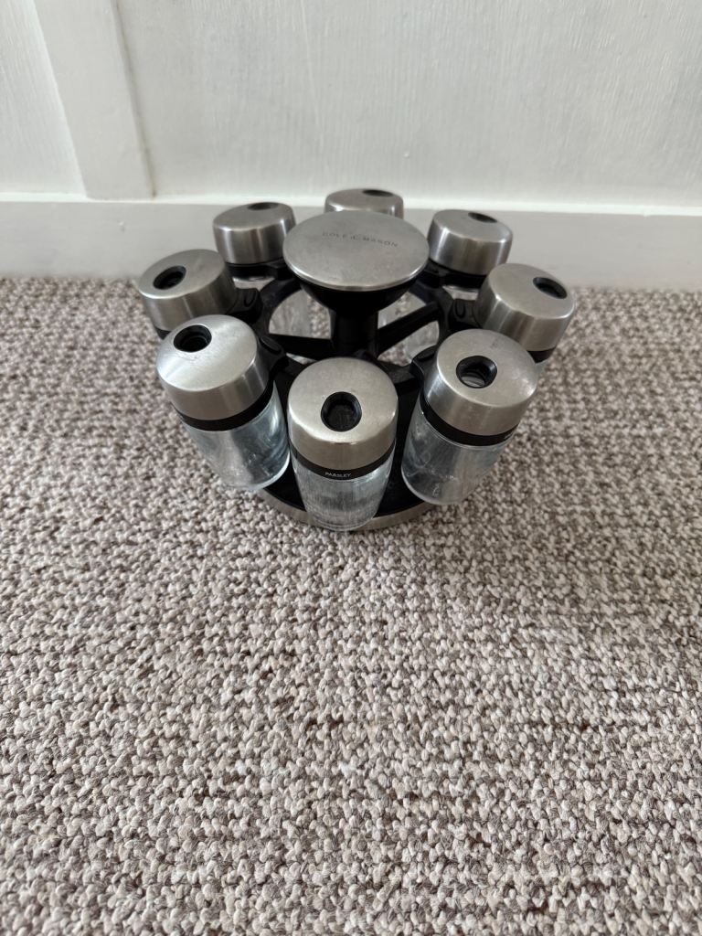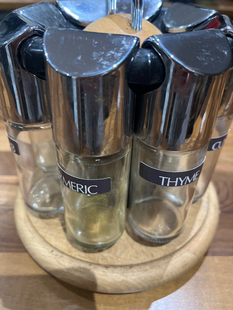 Swivel wooden spice rack with 8 glass jars. Has labels but can be re-labelled. Got a handle to move around and lift up.