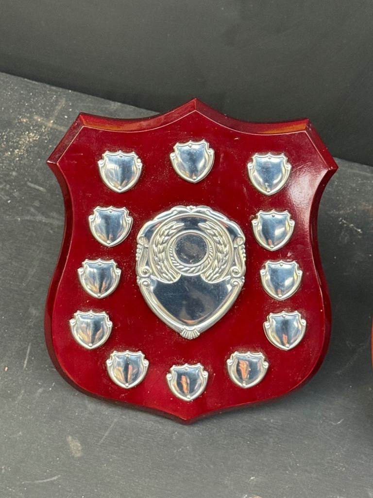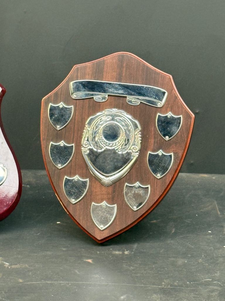 Large Presentation Shield (Brown Wood) which has been masterfully engraved on the metal scroll, central plate, and 7 individual winner plates.