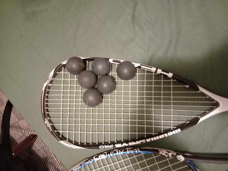 2x squash rackets, glass balls and bag