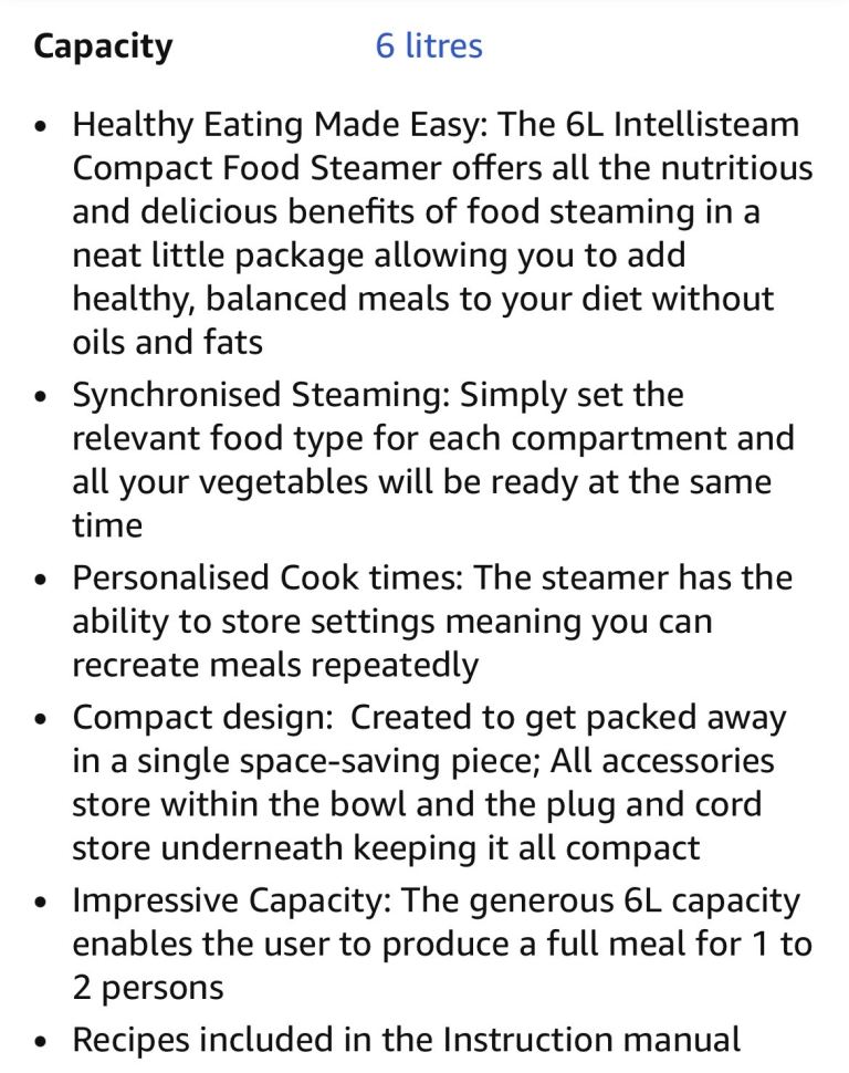 Synchronised Steaming: Simply set the relevant food type for each compartment and your food will be ready at the same time (for example can have chicken in one compartment and veg or rice in the other)