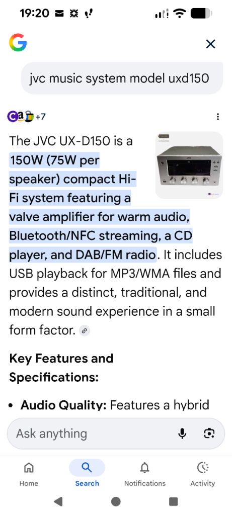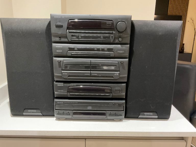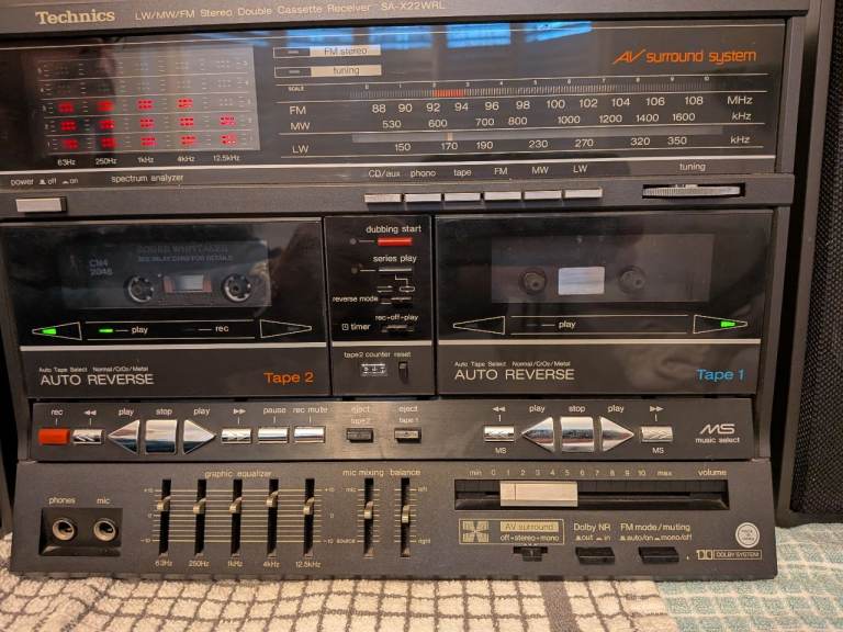 Twin auto-reverse cassette decks, LW/MW/FM radio, phono input, 4 speaker outputs, 5 band graphics equaliser, 5 band spectrum analyzer, Dolby NR, mix microphone input.