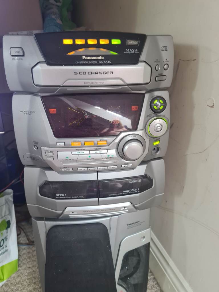 Panasonic hifi sa-ak45 excellent condition can be seen working twin cassette player 5 disk cd changer radio comes with remote control and informations book excellent hifi dosent get used apart from pluging tv and firestick into for the sound instead of a soundbar comes with both original speakers with detachable covers cash only