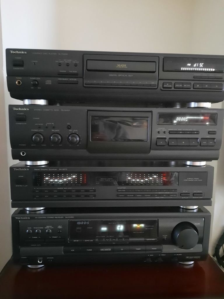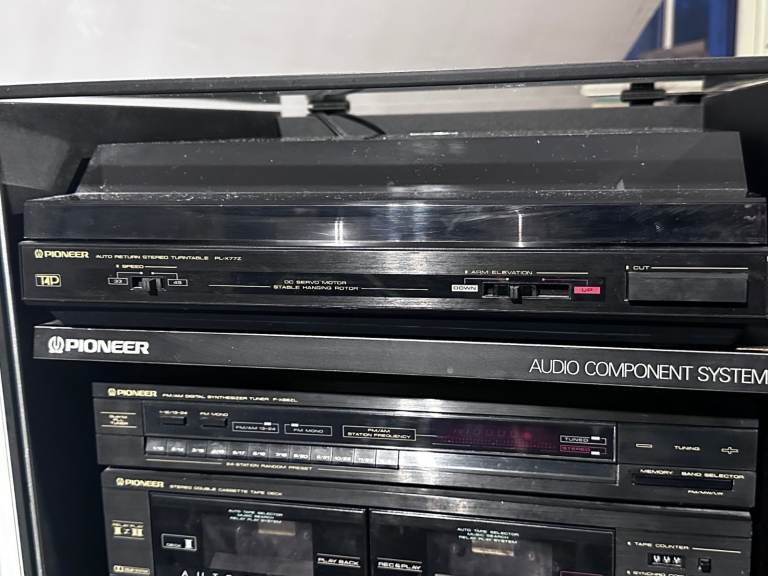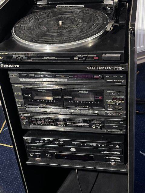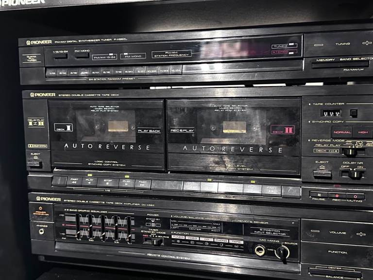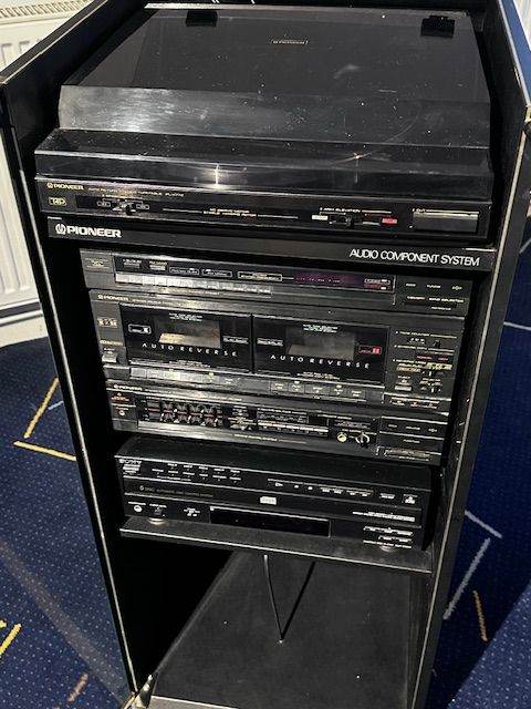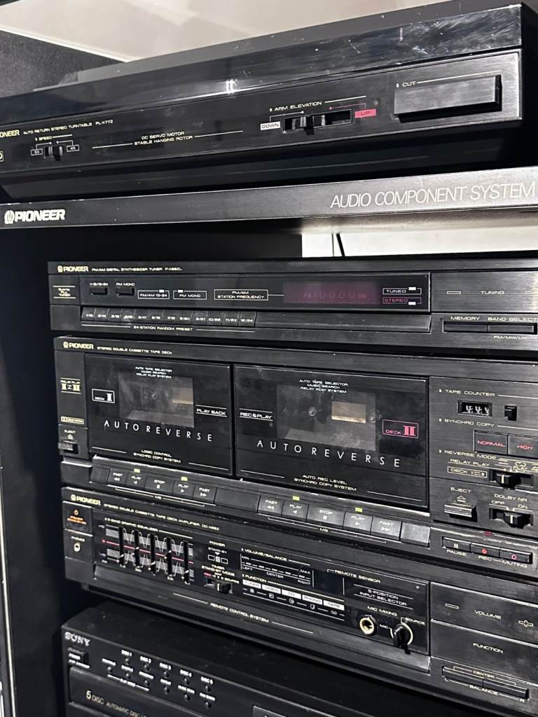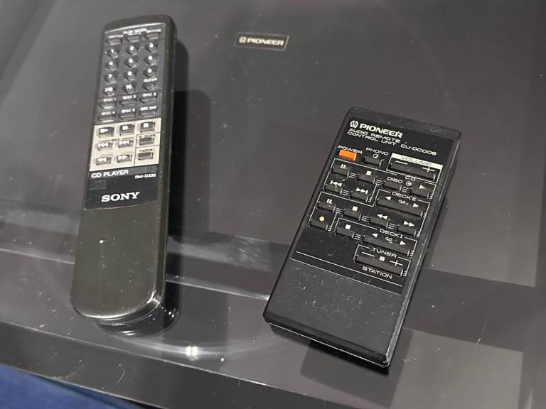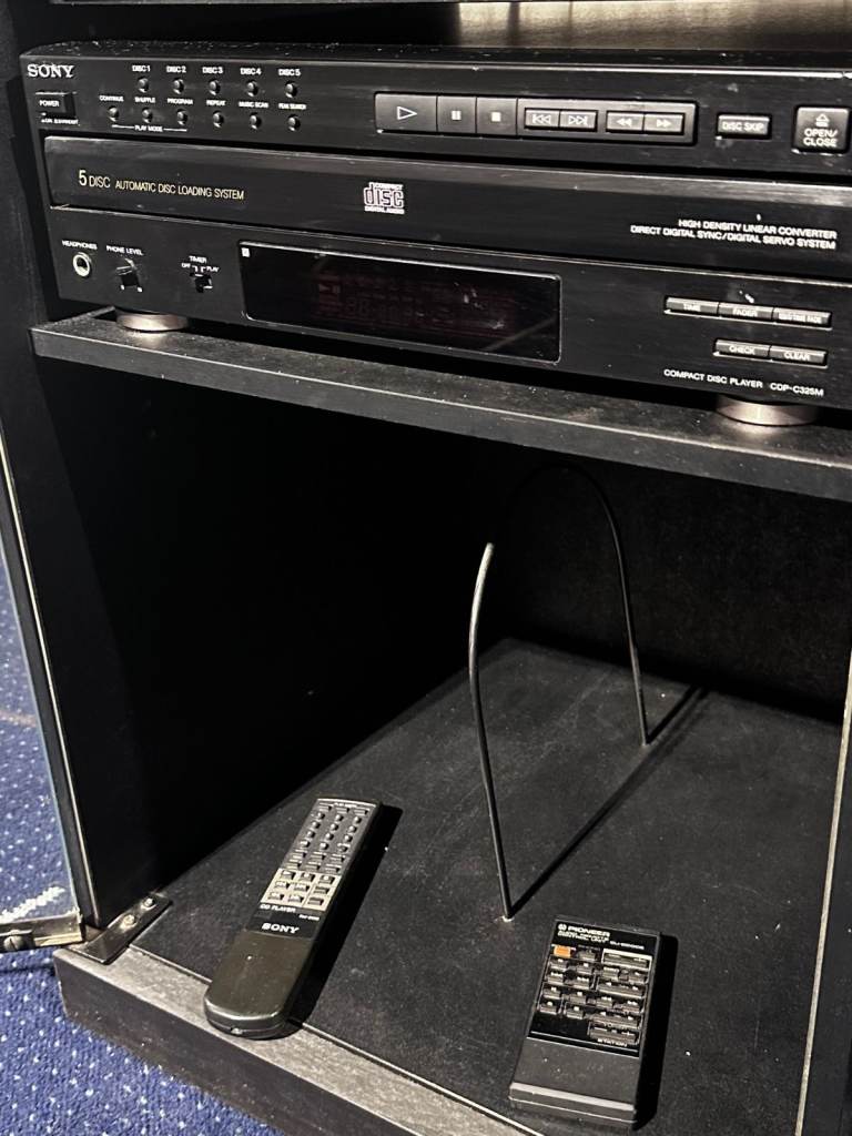 Pioneer music stack with Sony 5 disk deck and remotes in glass cabinet