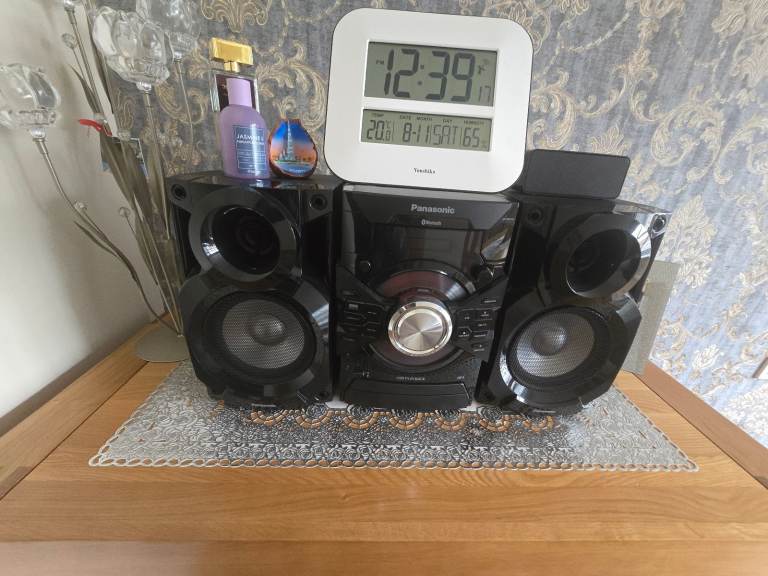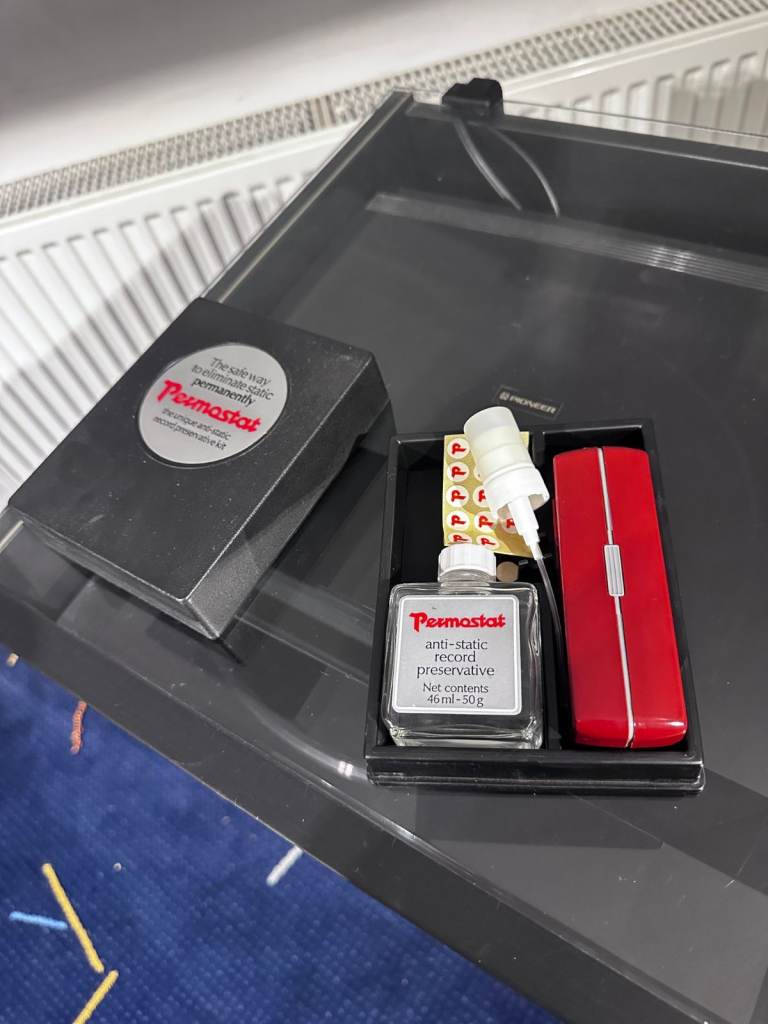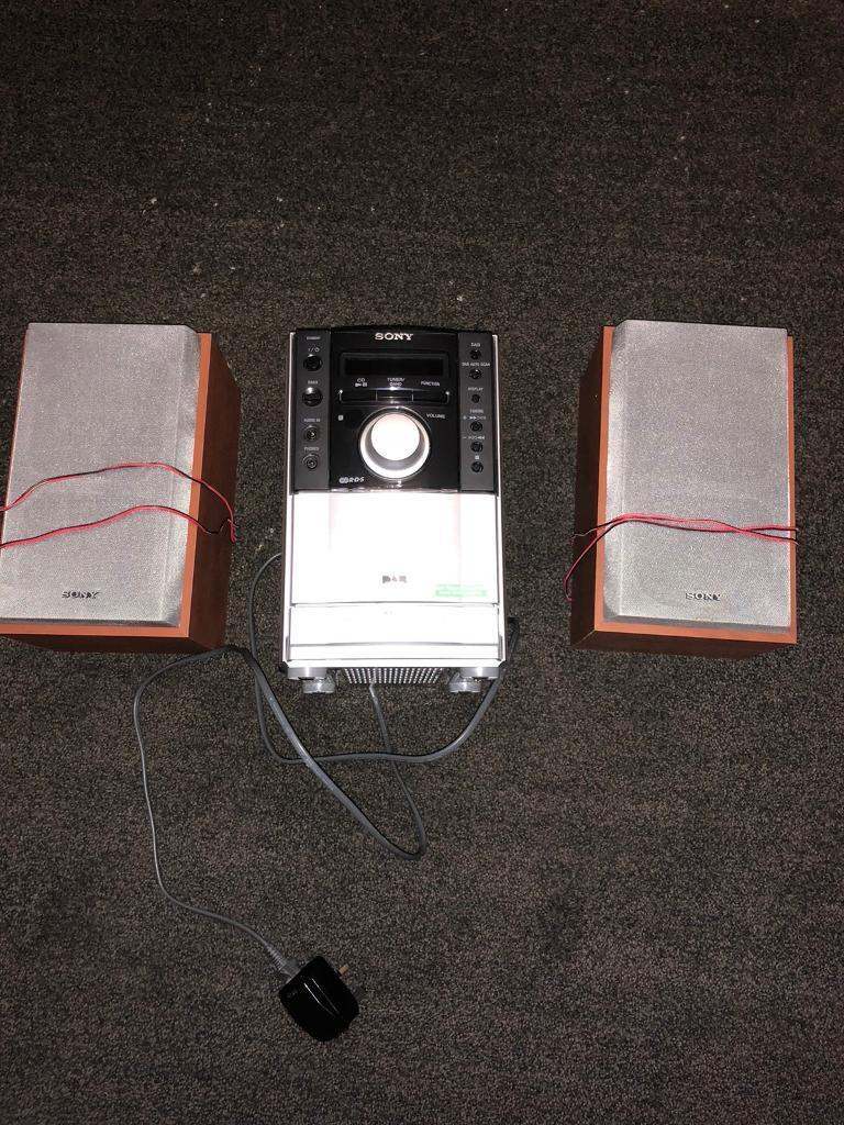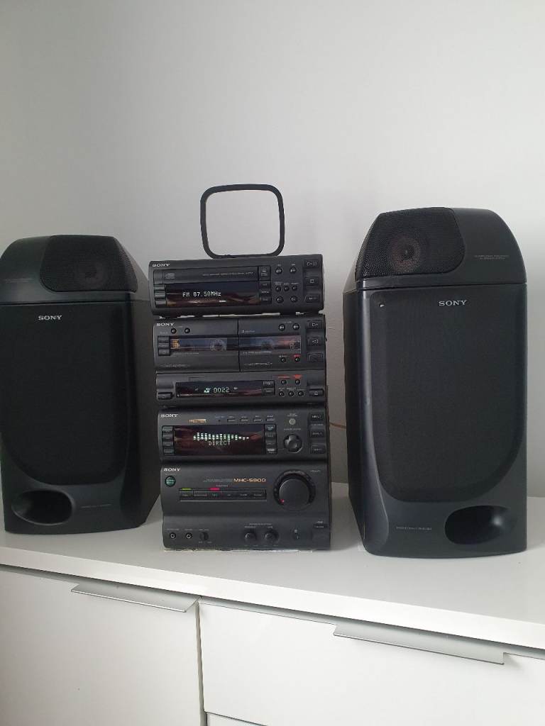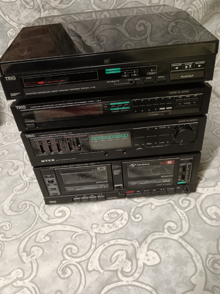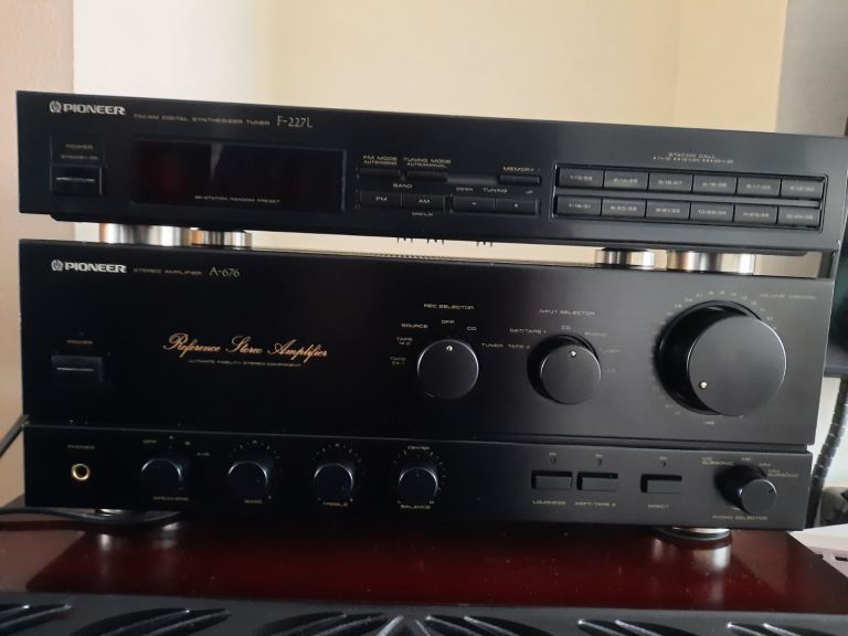 Pioneer music stack with Sony 5 disk deck and remotes in glass cabinet