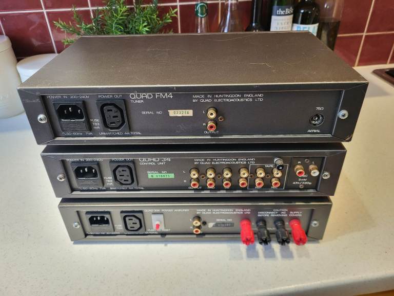 Quad system for sale, very good condition and all working great, consists of quad 34 pre amplifier with mm phono, quad 306 power amplifier and quad fm4 tuner. Includes all leads etc.