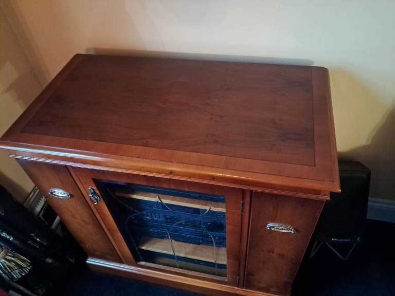 Music centre cabinet in excellent condition. Made from Yew. Central section has 2 shelves. Outside sections for CD's (each outside section holds 80 CD's). Collection only. Width 90cm, height 87cm, depth 47cm.