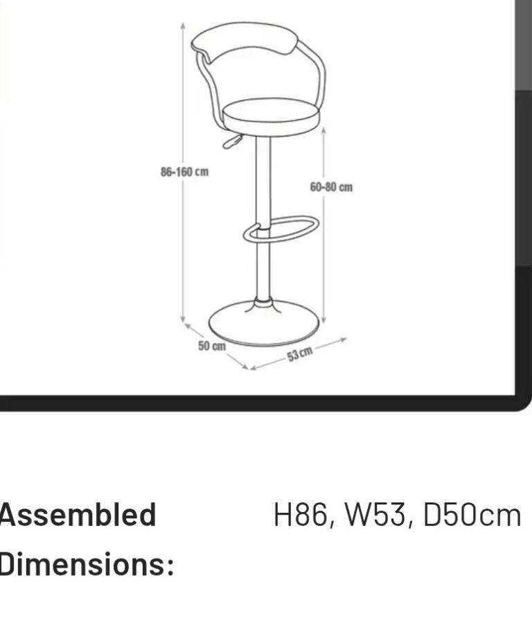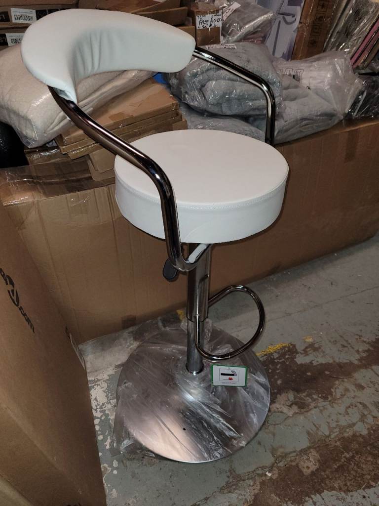 A new (slight seconds) Chrome plated frame with white Faux leather seat and back break fast bar stool with Adjustable seat height: 58cm - 80cm and Foot rest it has a small mark on the stand it is new and already built ( 1) only the measurements are enclosed in the pictures the r.r.p is 60.00 we are selling it for 30.00 collection only it is st aidens Church summer Bank Road Tunstall st6 5ey we are there mon to fri 9am to 3.30pm Saturday 9am to 3pm closed Sundays with thanks ( we only hold items for 24 hours only).