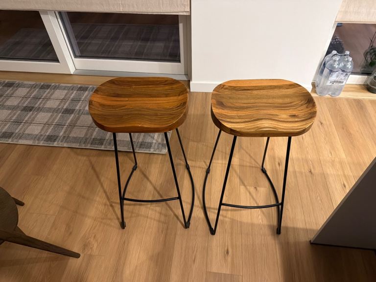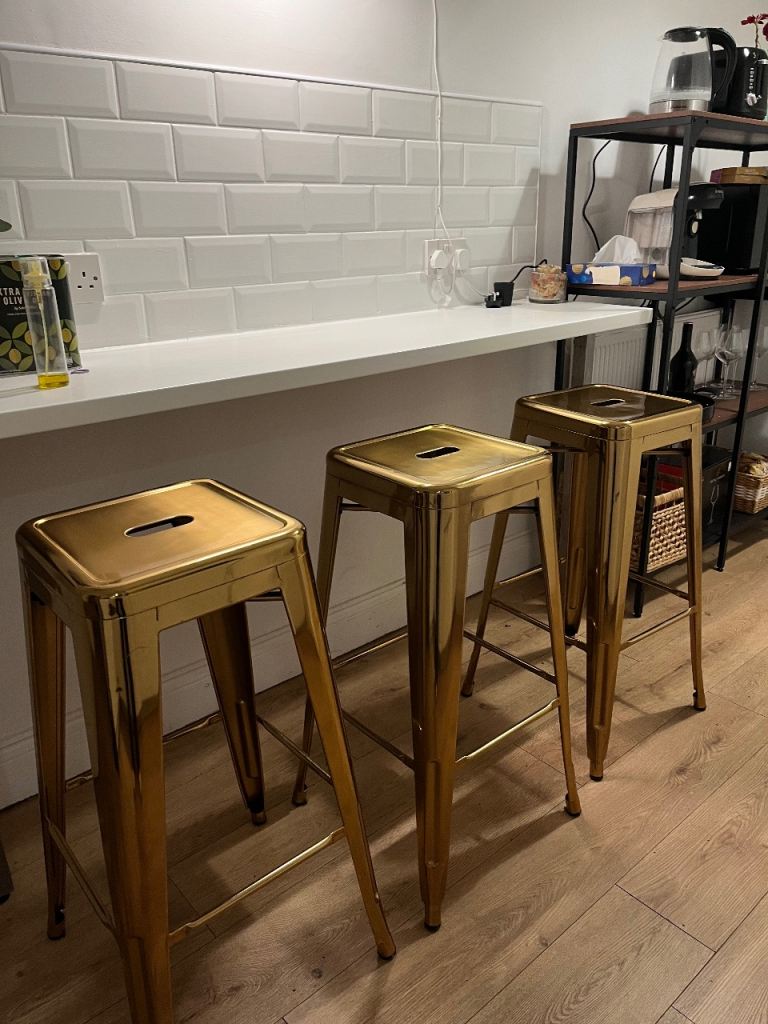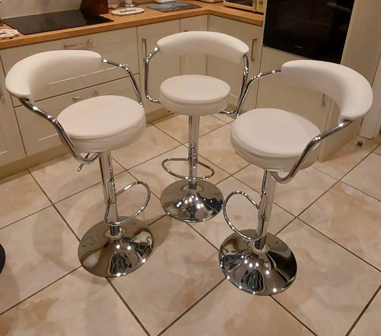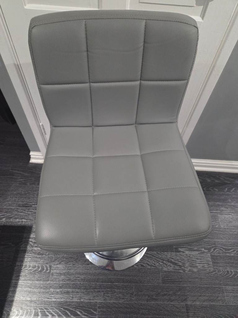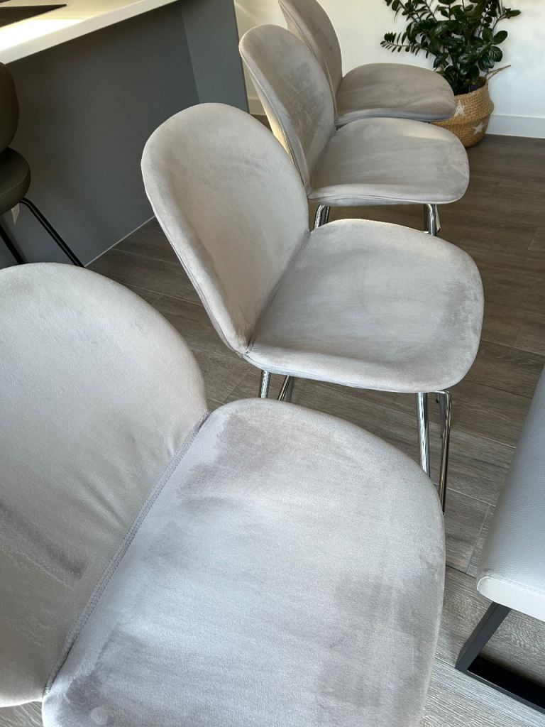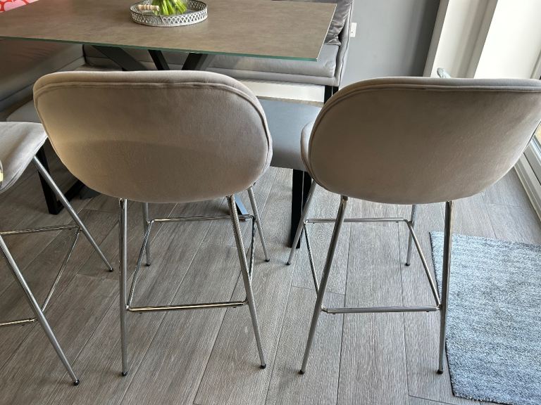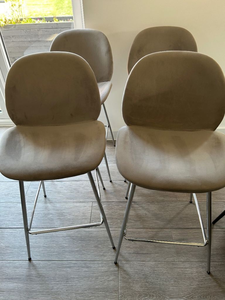 4 bar stools in brushed velvet light grey/silver seats with silver legs. Measures 94cm high, 65cm seat height, seat width 47cm, seat depth 37cm. Collection from a smoke and pet free home, Taverham NR8. £50