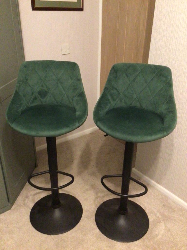 Two gas lift stools. Green velveteen. Lowest position 23inches/59cm. Highest position 31inches/79cm.